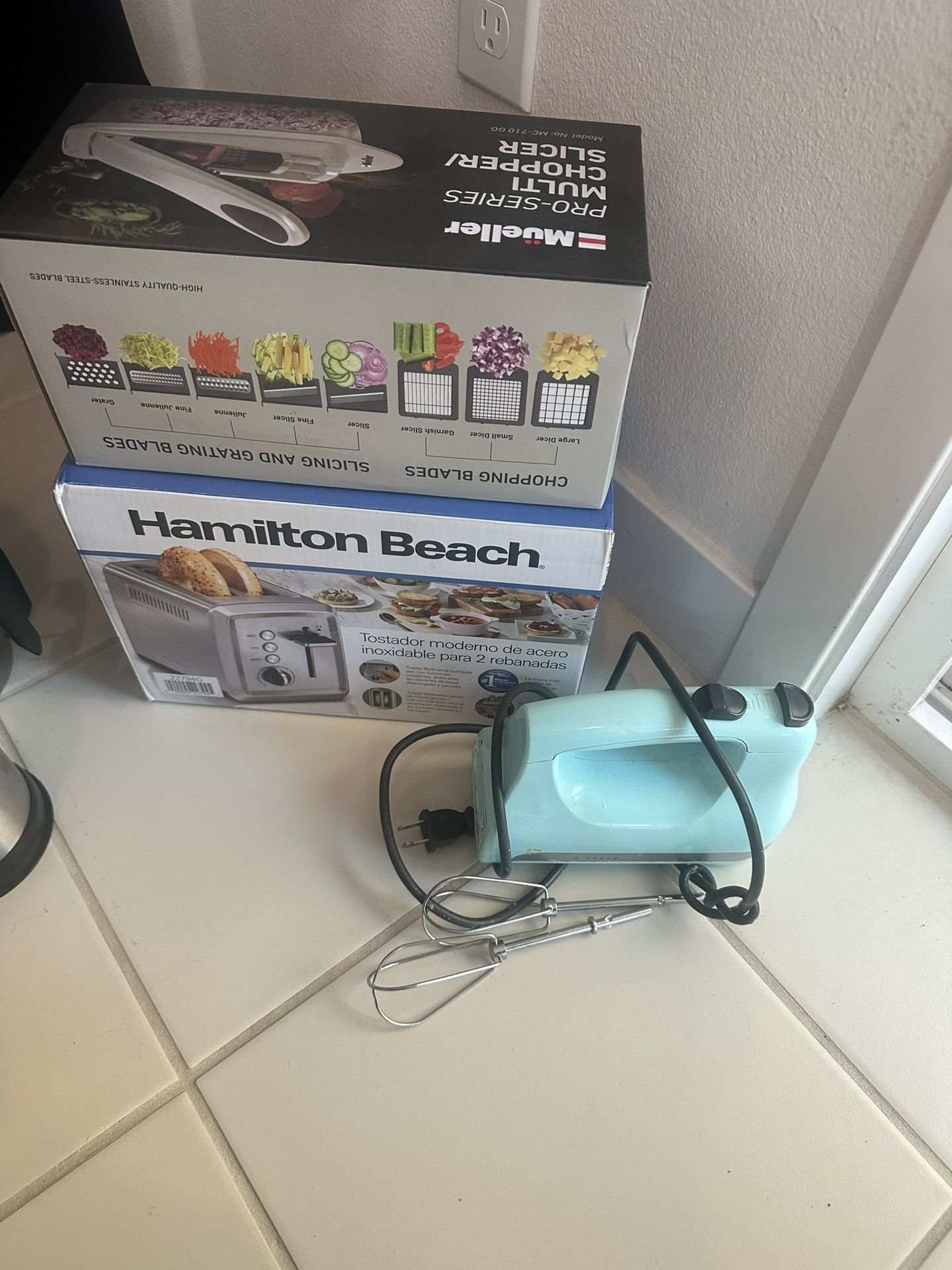 Kitchen appliance bundle in great condition: • Mueller Pro-Series Multi Chopper (boxed) • Hamilton Beach 2-slice stainless toaster (boxed) • Handheld electric mixer with beaters All work great. Perfect starter set for apartment, dorm, or someone setting up a kitchen. Selling as bundle only. Pickup only. Cash or Venmo accepted.