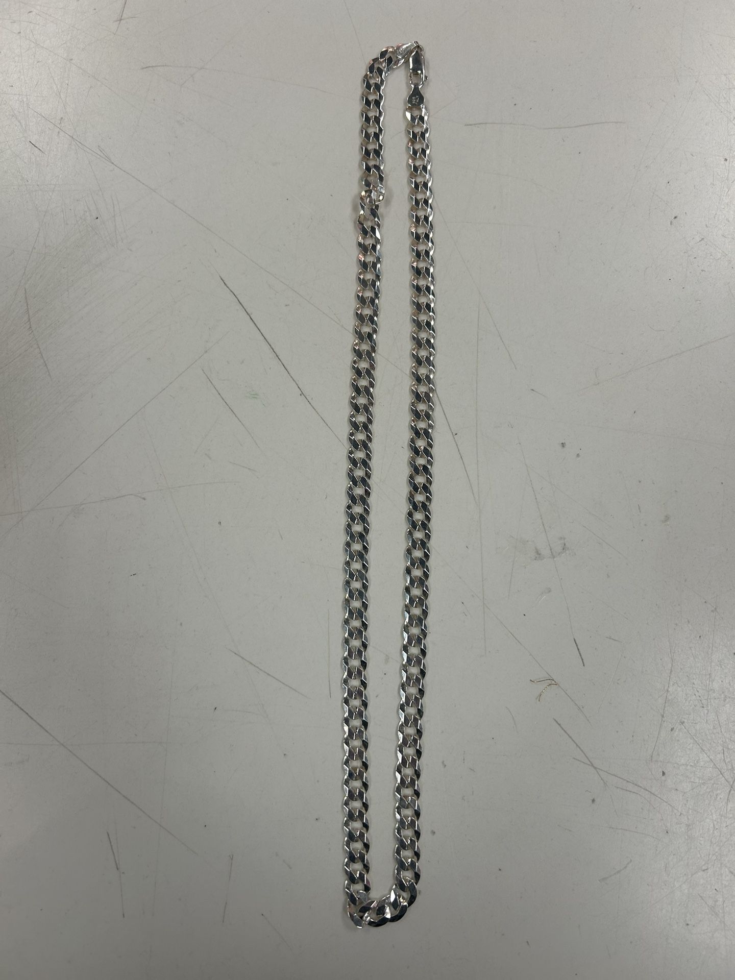 This necklace is crafted in solid 925 silver with a flat curb Cuban link design. High-polish finish enhances the reflectiveness, while the construction ensures durability and strong presence