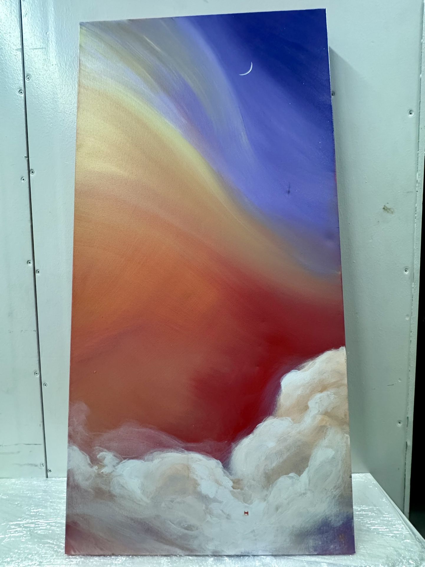 Large abstract canvas artwork featuring a smooth color gradient from warm reds/oranges into cool blues with soft cloud detailing and a subtle crescent moon and a hidden San Francisco Golden Gate Bridge peeking from the clouds. Beautiful, calming piece that works great as a statement wall art in a living room, bedroom, or creative space. Condition: • Overall looks great from a distance • Minor cosmetic damage/marks (shown in photos) • Does not affect display when hung Lightweight and ready to hang. Great option if you want a large statement piece at a lower price. Pickup in Hollywood. $150 OBO
