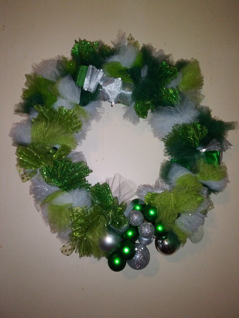 Christmas wreath 18 inch ring Green. Silver and white ribbons and bows