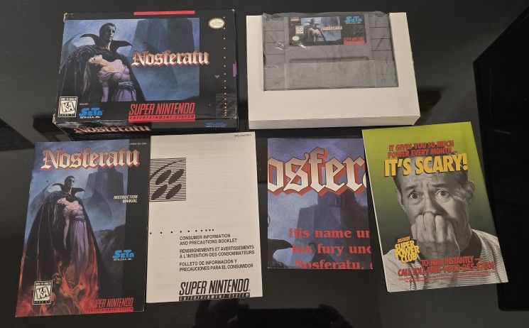 Nosferatu Super Nintendo (SNES) Complete in Box Very Rare Authentic Selling my original Nosferatu for the Super Nintendo, a highly collectible and hard to find title. This is a complete in box (CIB) set, which is extremely rare to come across in this condition. What’s Included (100% Complete): Original box Original cartridge Original dust cover Original inner bag All inserts Original poster Everything that came with it from factory Condition: This game is over 30 years old, so it naturally has some cosmetic wear from age, mostly on the box. Nothing major just typical aging for a rare SNES title. The cartridge, inserts, and poster are all in good shape and fully intact.