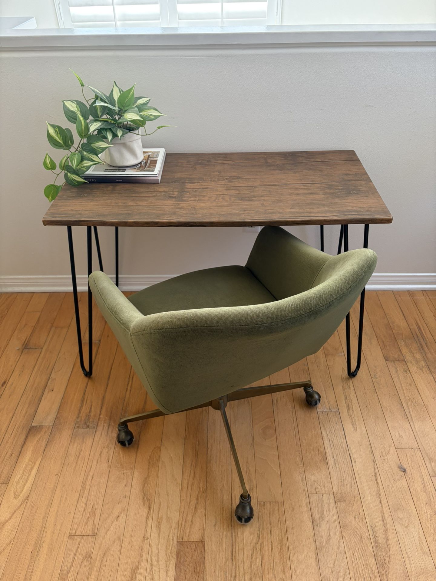 Desk is great for a tight space. Chair is for sale in a separate post. $60obo 39.5” (W) x 19.5” (D) x 27” (H) Office, desk, mid century, modern, house, decor, chair, living room, vintage, wood, metal