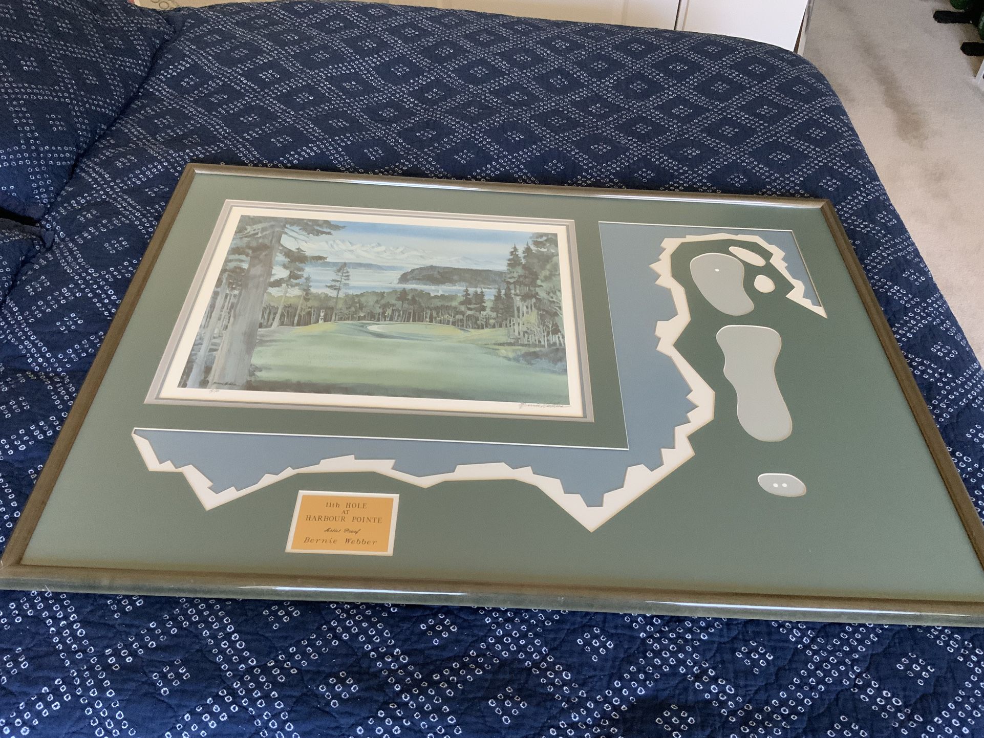 Beautifully framed Bernie Webber Artist Proof. 11th Hole at Harbour Pointe Golf Club n Mukilteo. Non glare glass dimensions 39 inches x 27.5 inches. An incredible buy worth over $1,500. This article is like new with no marks on the frame.