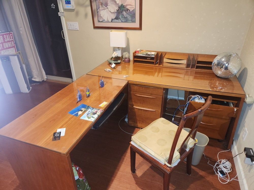Originally $2,000.00. All real Teak wood, designed in Hawaii, nice finish, and glass tops. Comes with extra, matching, filing cabinets($1,200 each, new). All drawers roll smoothly and are in, like new condition. Measurements: The desk that has the keyboard tray is 47x24 and 30 high. The other desk that's over the 2 file cabinets is 31 deep and 30 in and 71 long. The 3-drawer cabinet on the left is 18 1/2 wide by 28 1/2 tall The 3- drawer on the right is 19 wide and 24 high. Both cabinets have hanging edges in their bottom drawers and both have 2 keys each The top section that has two drawers is 8 3/4 deep , 47 in long and 5 3/4 high. This is a very nice, professional, office desk. Selling this house, so Desk has got to go. Asking $850, o.b.o. This is a smokin' deal, for furniture this nice, and of this quality!!!