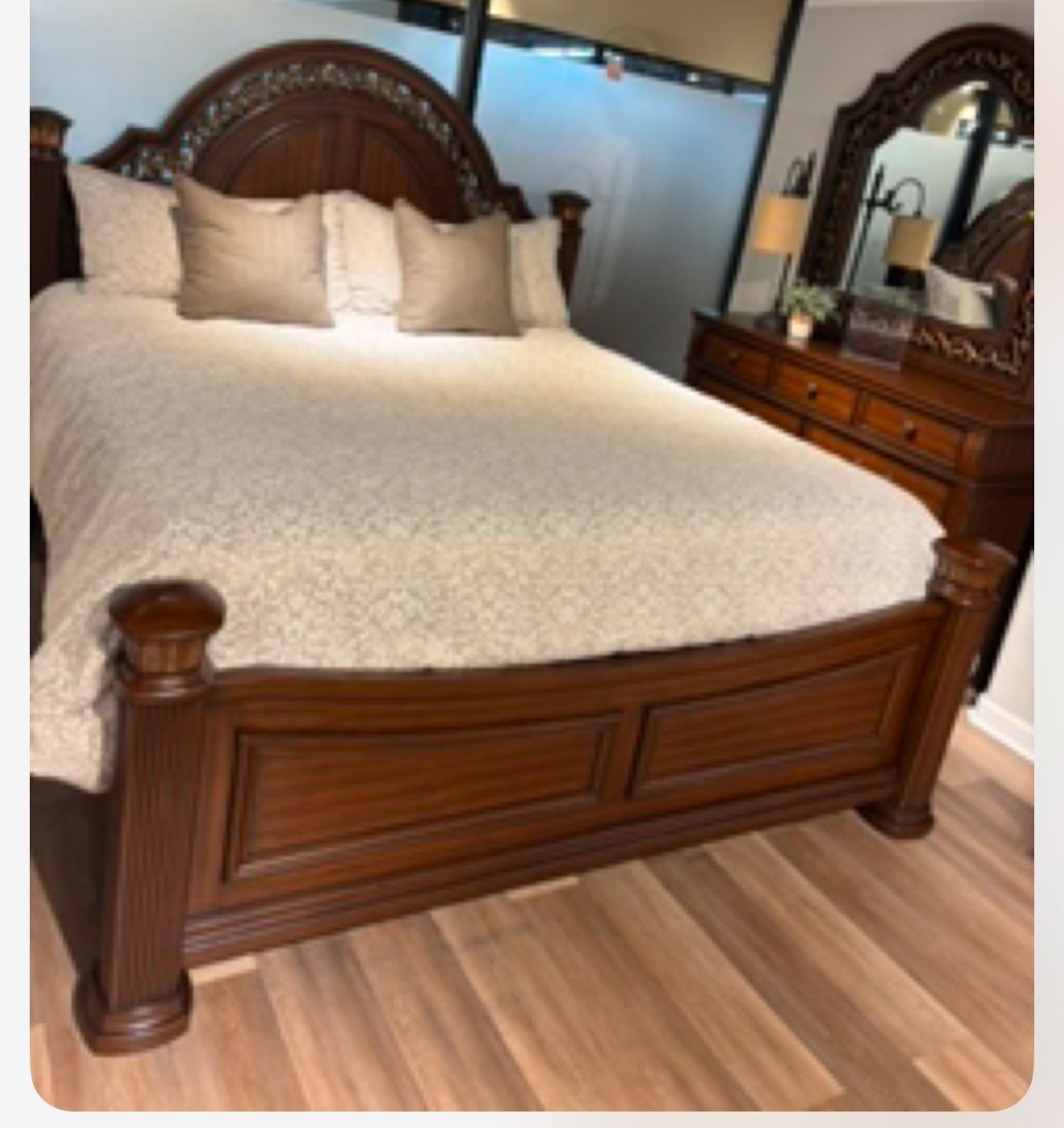 Include king bed size Chest Dresser with mirror 1 nightstand Floor sample
