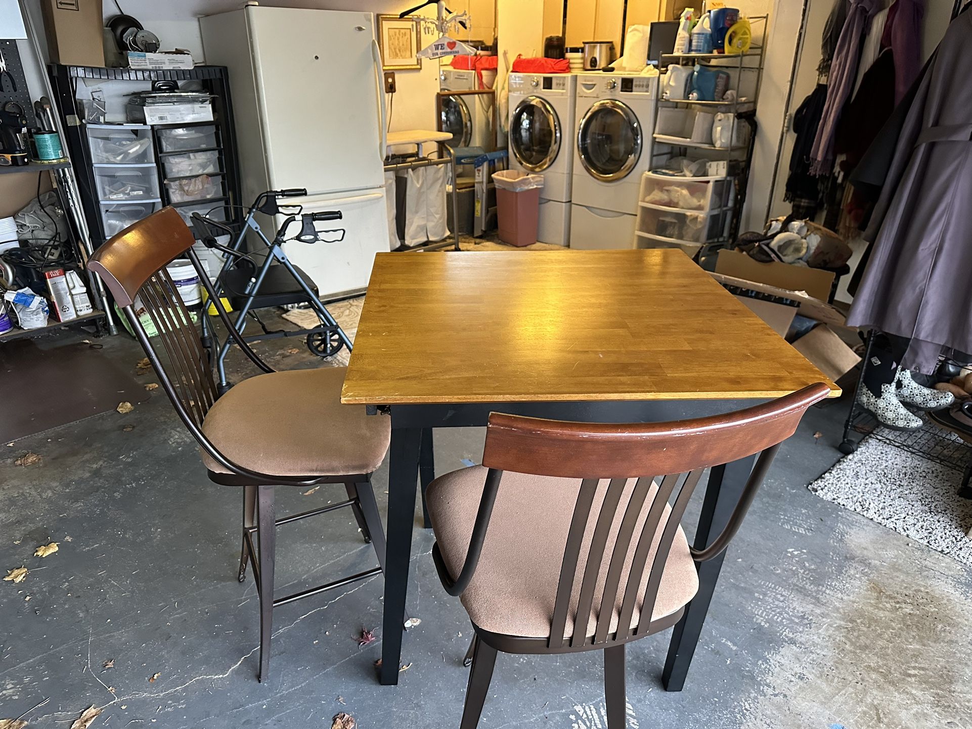 Beautiful wood table 3’x3’ square. Plus 2 custom made stools