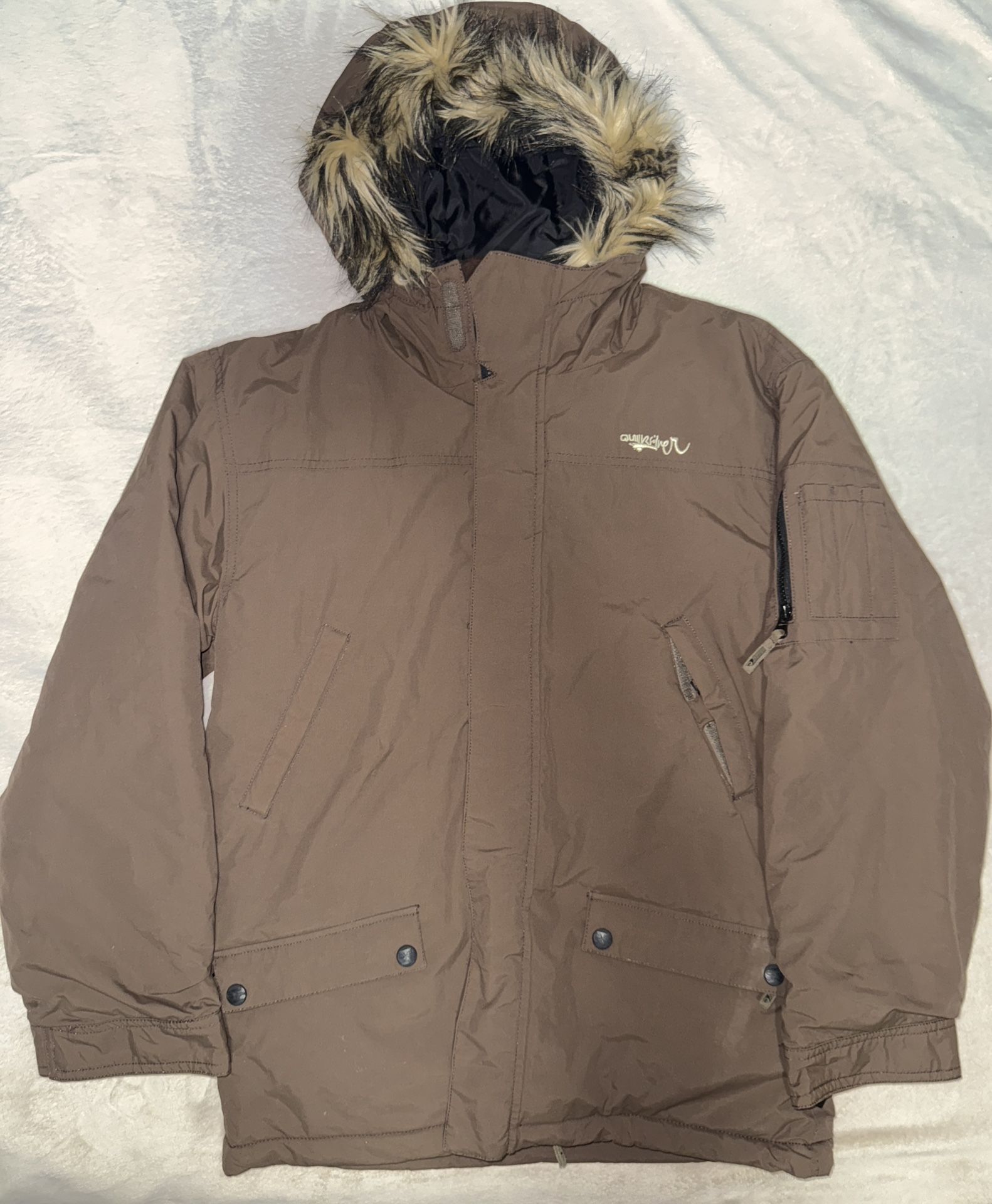 Quicksilver QS Squadron No. 70 utility jacket in size Large. Clean, excellent condition, no flaws. Fully working zippers. Insulated and super warm with a waterproof shell (5000mm, fully taped seams). Faux fur-trim removable hood.