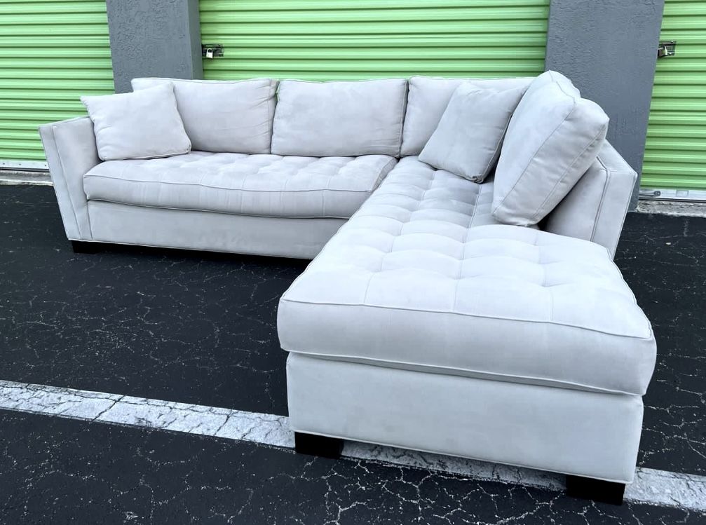 Comfortable Back & Seat Cushions. Smooth Durapella® Microsuede Fabric. Two Sections: LAF Sofa, RAF Chaise. Excellent Shape. Original Condition. Professionally Steam Cleaned. Filone Model by Ashley HomeStores Dimensions: Width 112in, Chaise 86in, Seat 19in, Depth 39in, Height 38in. Pickup in 92109 or Delivery with Zipcode.
