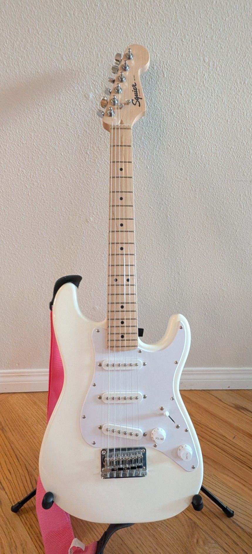 Mint mini-strat from squier. Purchased for a kid who switched to piano. Replaced the tuners as the stock would not hold a tune.