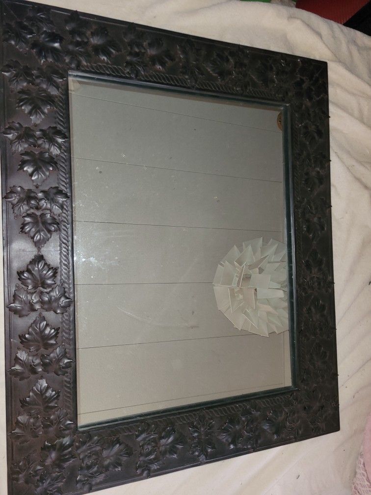 Crate & Barrel wall mirror. The frame has been clad in metal with applied leaves also in metal. It has a matte black finish. It is further enhanced by a rope pattern around the perimeter of the mirror. The mirror has a very three dimensional quality. Outside dimensions 32 x 39, mirror dimensions 21.5 x 29. Pick up South Tacoma by Regal Cinemas