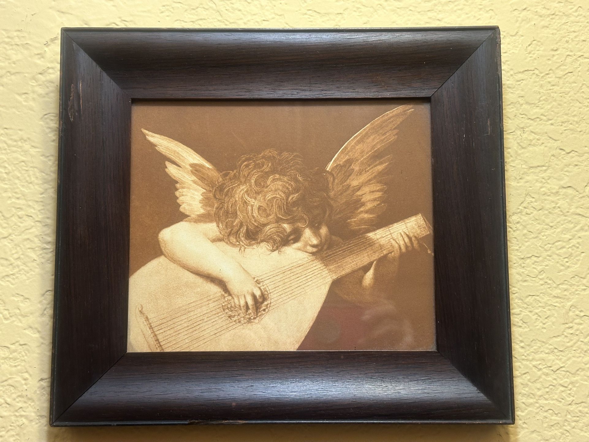 Vtg "Musical Angel" or "Cherub Playing a Lute" by Rosso Fiorentino Print in Solid Wood Frame
