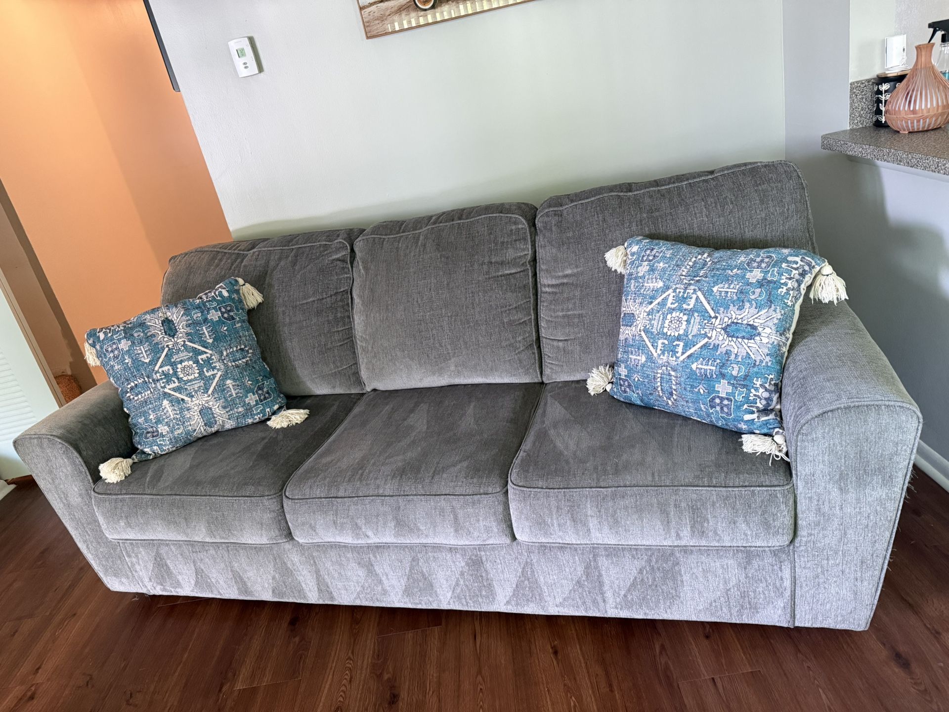 Clean, comfy couch- accent pillows included! Some wear on the back side of the couch as seen in photos. Comes from a clean, smoke-free home.