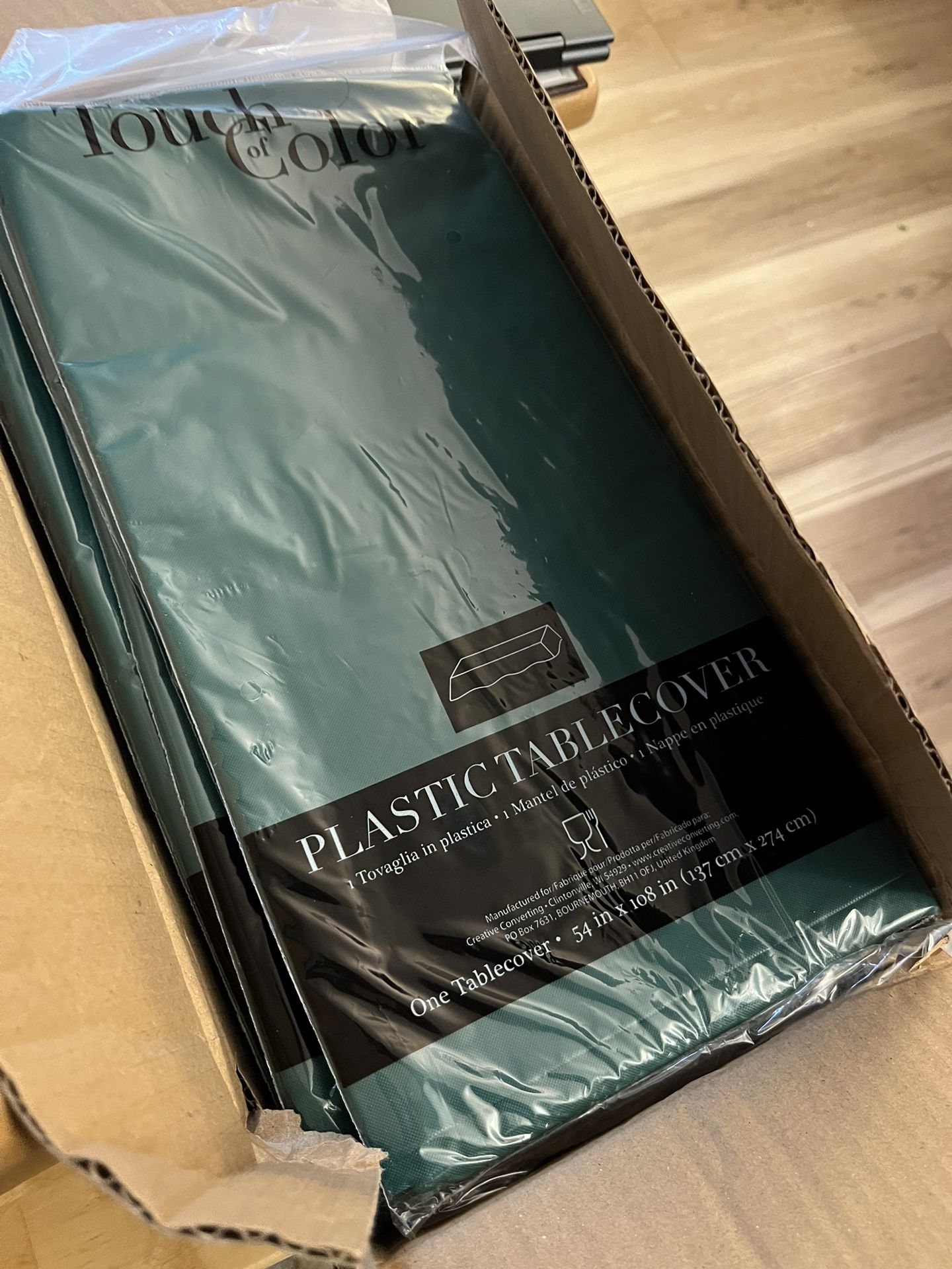 The box these were in never made it to the venue. Our loss is your gain. Dark green color, difficult to see with the shine of the cellophane wrapping, so I included a close-up of the vent hole in the wrapper to better show the color. 54”x108”