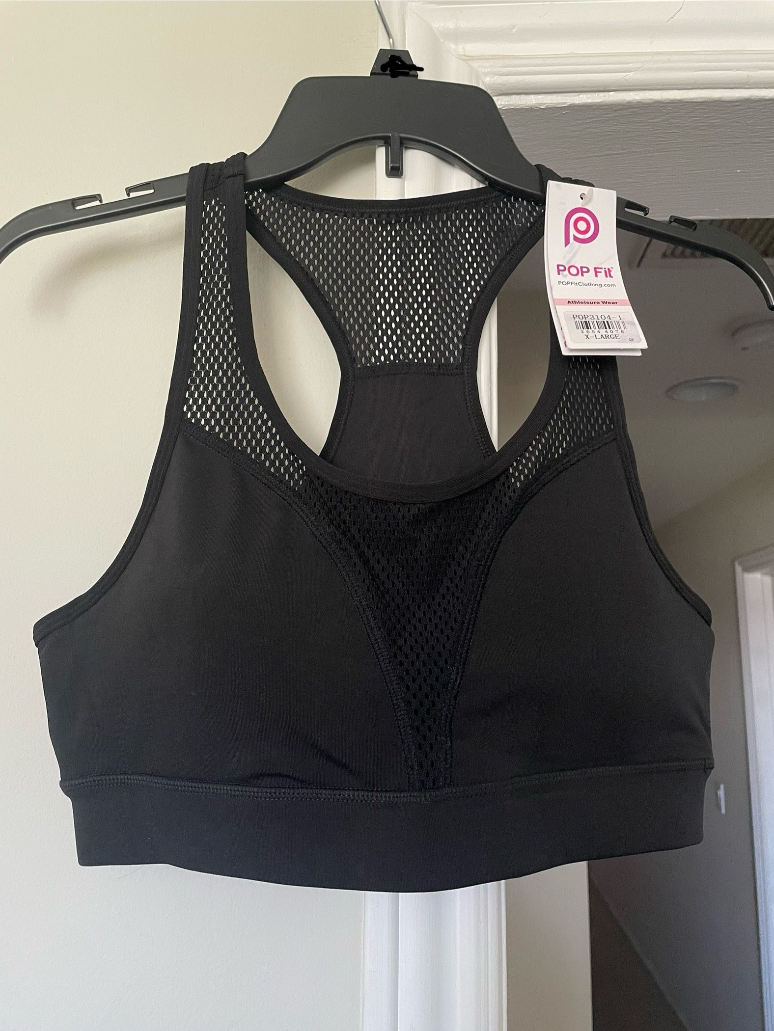 Black sports bra, Size XLarge (run small), 92% polyester 8% spandex. Padded bust, good support. Local pick up preferred. Cash only.
