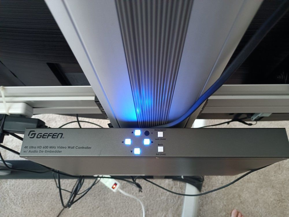 Video Wall Bundle with (4) SAMSUNG TVs with rolling stand & screen split controller, 111 inches total diagonal length Condition is used for a few events but no longer needed Some small residue streaks present on screen face Connection device for the four screen protection is a Gefen UHD 4K 600 MHz Video Wall Controller with Audio De-Embedder Dimensions Product Height With Stand 75 inches Product Width 96 inches Diagonal length 111 inches TV depth with mounting 3.5 inches Depth from front of TVs to controller box 11 inches 4-Screen UHD Video Wall Display System includes Mounted TV stand, Cables Create a high-definition display with this 4-screen UHD video wall system, perfect for sports bars, airports, universities, or offices With HDMI connectivity, this video wall is compatible with a variety of devices. Upgrade your venue today with this high-performance, visually stunning 4-screen video wall display system! Includes: (4) Mounting Brackets, (4) Screens, Power Cord, (4) HDMI Cables, Cables Ties Specifications for Samsung TVs Loaded with features, the NU8000 has advanced smart browsing with voice control, which finds your shows easily. Stunning depth of HDR Plus and more colors than HDTVs create a breathtaking 4K picture Product Type Ultra HDTV 4K Premium Picture Dynamic Crystal Color HDR Plus 4K UHD Auto Game Mode UHD Engine Motion Rate 2401 Ultra Slim Array Contrast Enhancer Design Clean Cable Solution Wide Viewing Angle2 360 Design Bezel Color: Slate Black Bezel-free Design Smart TV with Bixby Voice Universal Browse Connect & Share Samsung OneRemote3 Connections 4 HDMI Connections4 2 USB Connections LAN Port 802.11AC built-in Wi-Fi Bluetooth RS232 Control (EX-Link) IP Control Support5 Optical Audio Output Port Audio Dolby Digital Plus 40 Watt 4.1 Channel Included Accessories Samsung OneRemote Industry Certifications CTA 4K Ultra HD Connected Connections HDMI Enjoy higher-quality audio and video with an HDMI connection that transmits both signals over a single cable. Compatible with next generation Ultra HD Blu-ray players and HDR content decoding. Includes 1 Audio Return Channel (ARC) Wi-Fi Enjoy your favorite on demand content seamlessly through your existing network with built-in Wi-Fi (802.11AC). Audio Dolby Digital Plus Enjoy the ultimate digital sound quality on all your favorite movies, TV shows and streaming content Dolby Digital Plus optimizes your entertainment experience with enhanced sound richness and clarity Included Accessories Samsung OneRemote (TM-1850B) Details for Gefen Wall Controller Up to UHD 4K Input Full HD 1080p Output 1 x HDMI Input 4 x HDMI Outputs RCA Analog Stereo Audio Outputs LAN Web Management HDCP Supported Features Display your UHD 4K source video to a video wall with up to four Full HD outputs with this UHD 4K 600 MHz 1x4 Video Wall Controller from Gefen. This controller supports up to UHD 4K60 HDMI input and four 1080p HDMI outputs, and it also features HDCP support. The unit can also de-embed the HDMI input audio into analog RCA stereo outputs for use with separate speaker systems The controller settings are accessed by an RJ45 port over IP using the unit's web server, and it can also be configured via Telnet The RS-232 DB-9 port can be used to plug in an automation control device that uses command line tools for configuration The front-panel buttons allow you to control the menus and settings The firmware is updated via the mini-USB port using the downloadable Gefen Syner-G software suite Video Wall Controller divides an input signal up to UHD 4K into four separate signals up to 1080p60 to be scaled and sized for each output Controllable via front-panel controls, IR remote, IP web server interface, Telnet, and RS-232 Input resolutions up to UHD 4K60 4:4:4 with HDCP 2.2; output resolutions up to 1080p60 Analog L-R RCA stereo audio output for use with outboard amplification systems Easy to use on-screen web server interface 3.5mm IR input on back panel to connect the included EXT-RMT-EXTIRN IR extender module if additional IR range is needed HDCP compliant Field-upgradeable firmware using the Gefen Syner-G software over the mini-USB port Default pre-configured layout arrangements make easy setup for different monitor layouts Custom layout can be setup for special monitor arrangements that go beyond the usual preset layouts Locking power supply connector This 2x2 4k Video Wall System is an ideal solution for environments that require an effective large scale medium for displaying your digital signage / video content such as Casinos, Sports Bars, Super Markets, Shopping Malls, Air Ports, Churches, Data Control Centre, Conference Rooms, Education and Training Samsung TV MODEL: UN55NU8000 ORDER CODE: UN55NU8000FXZA SCREEN SIZE CLASS: 55" SCREEN DIAGONAL MEASUREMENT: 54.6" UPC CODE: (contact info removed)68 COUNTRY OF ORIGIN: Mexico DIMENSIONS (INCHES W x H x D): TV WITHOUT STAND: 48.3 x 28 x 2.2