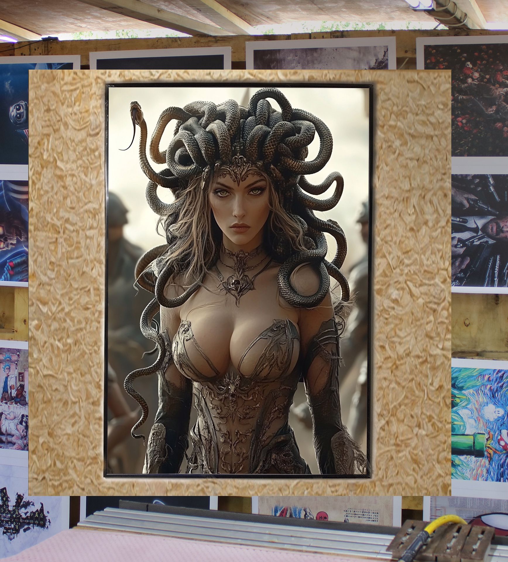 Framed poster ready to hang This is a framed, ready to hang poster. The exact measurements are 27x40 inches( 2.3 ft X 3.4 ft). Check my listing, I have many options or send your own designs or Ideas for a design. The image is a image generated with artificial intelligence.
