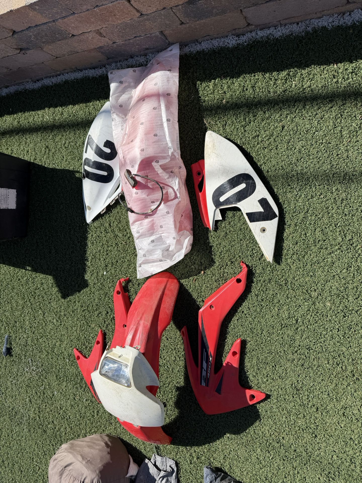 Plastics for a crf450x with head light and break light brand new oem rear fender, the right rear has a hole from my exhaust but I have another one if you really want the whole set !