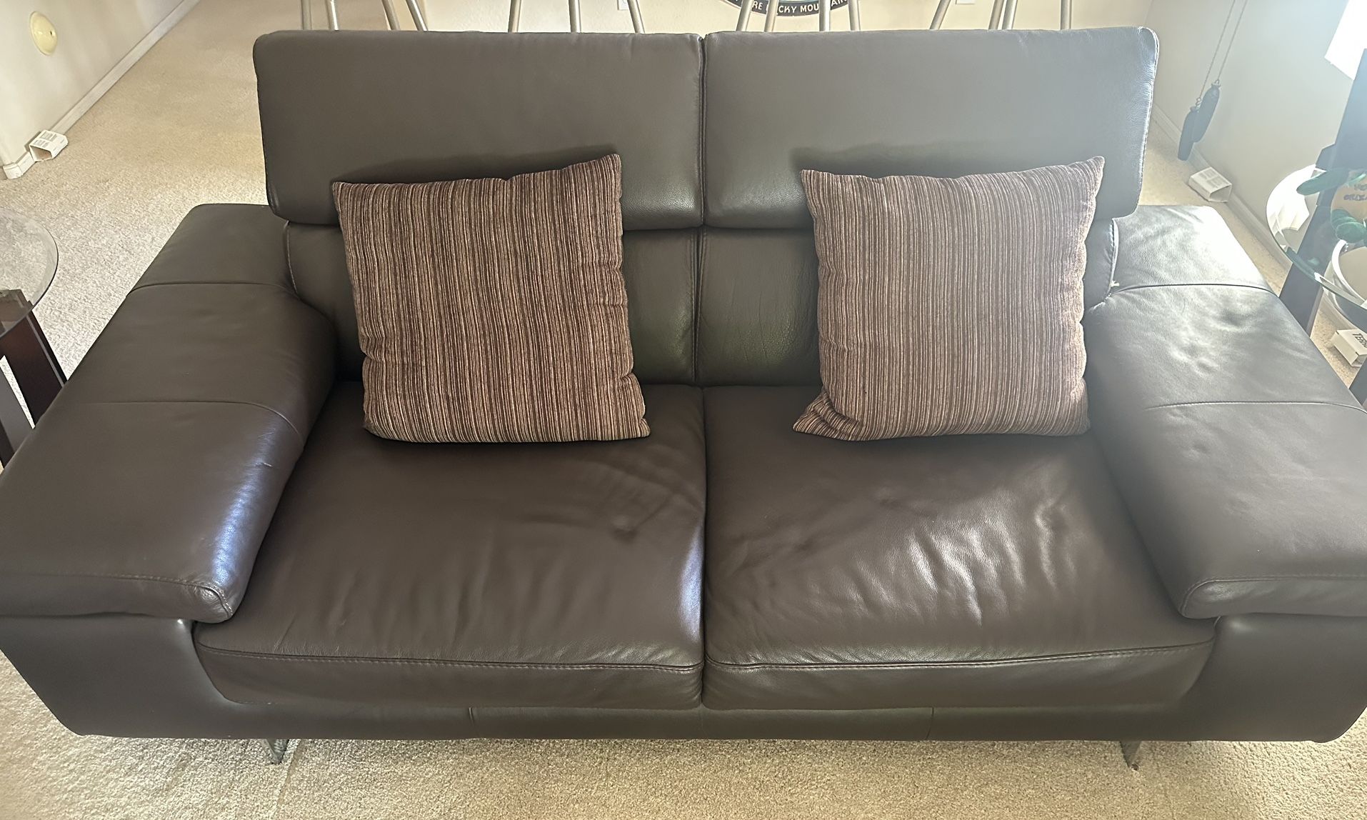 Dark brown sofa and love seat, came from Copenhagen. Back rest can fold down. Good condition