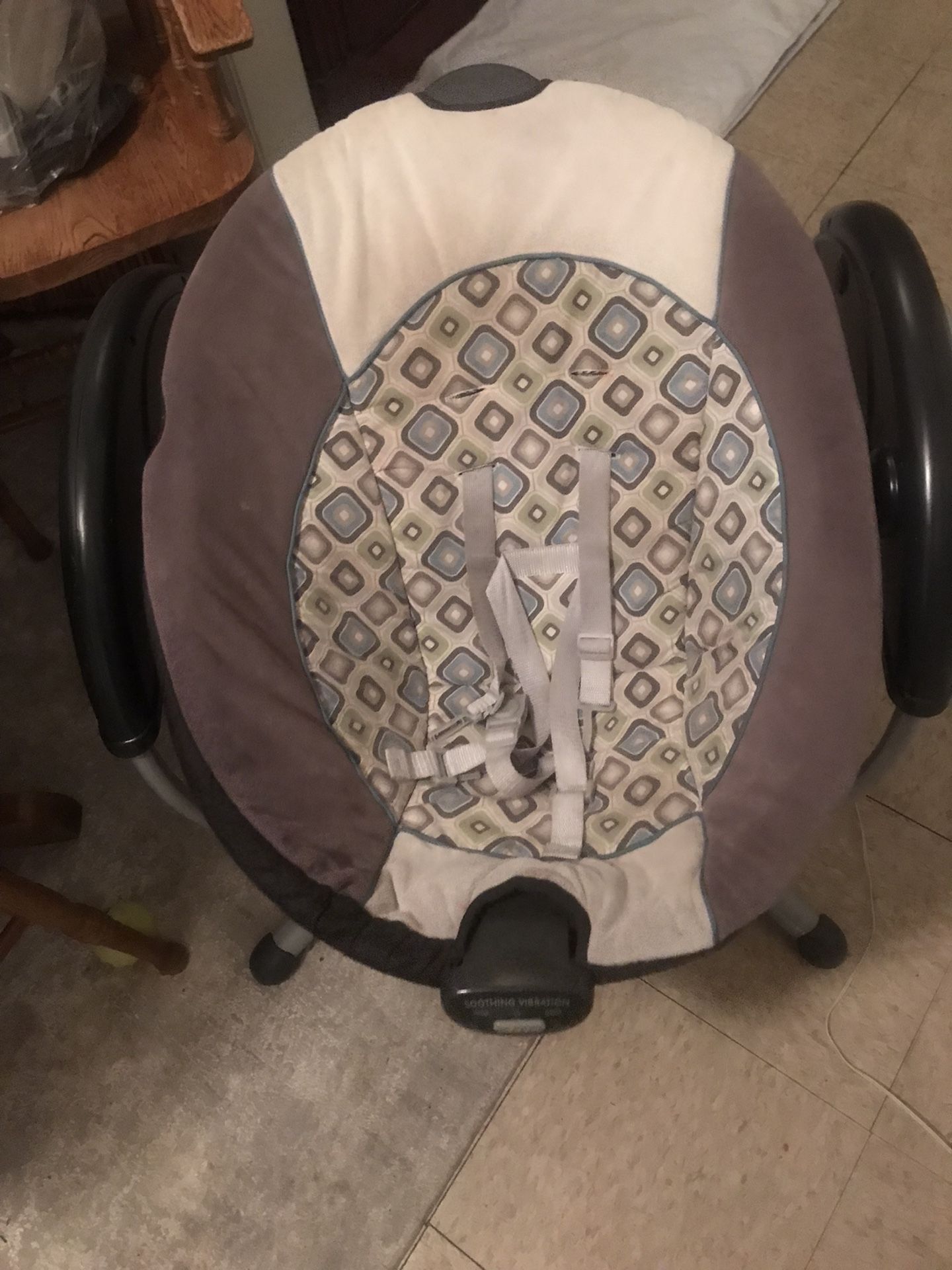 Can set on 6 different speeds, has 15 different Melodie’s, also nature and water and heartbeat sounds, can adjust to sit up, or lay back, easily transportable,, like new
