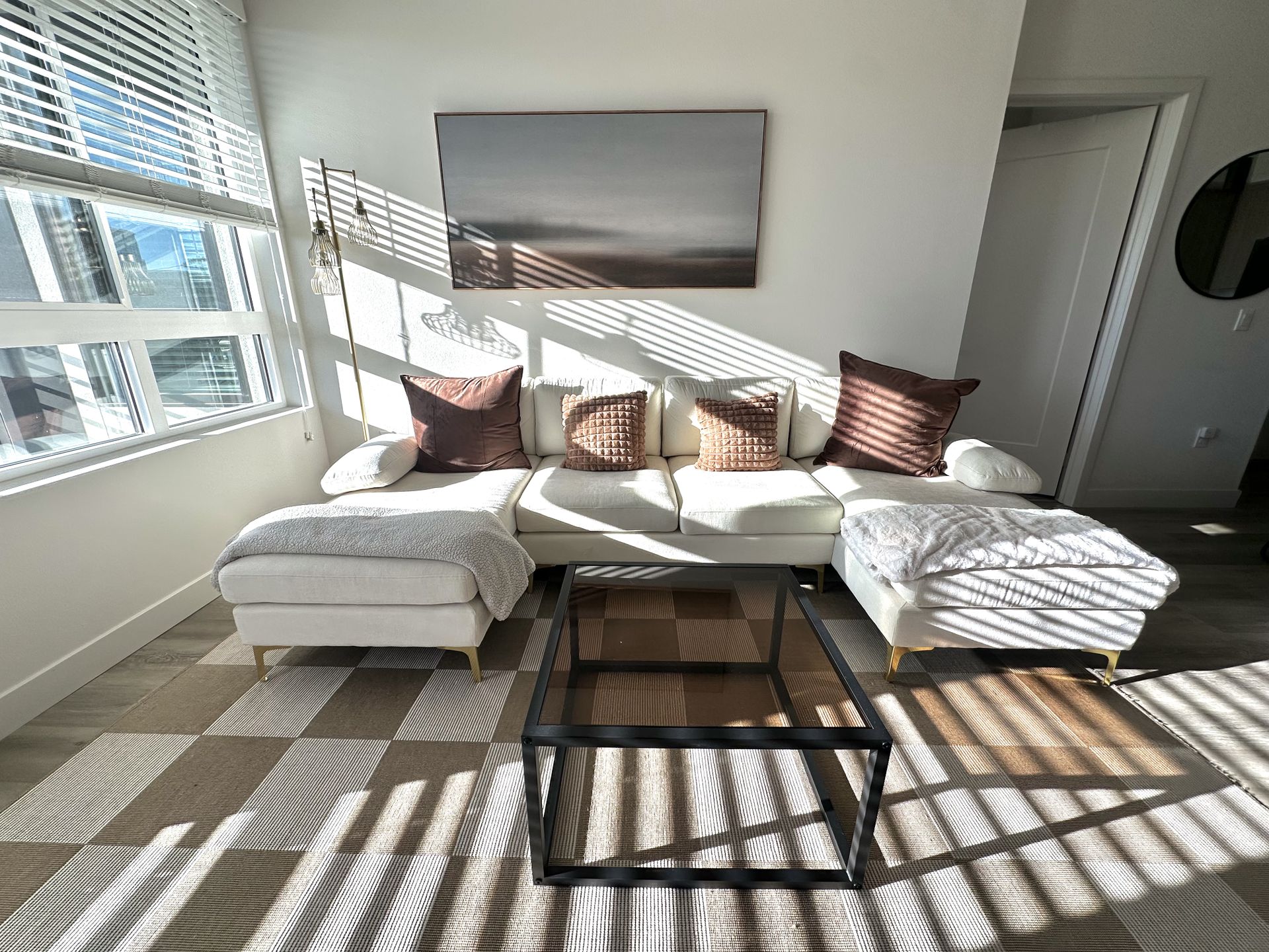 everything in this photo is for sale: couch - $550 rug - $100 table - $65 lamp - $100 painting - $100