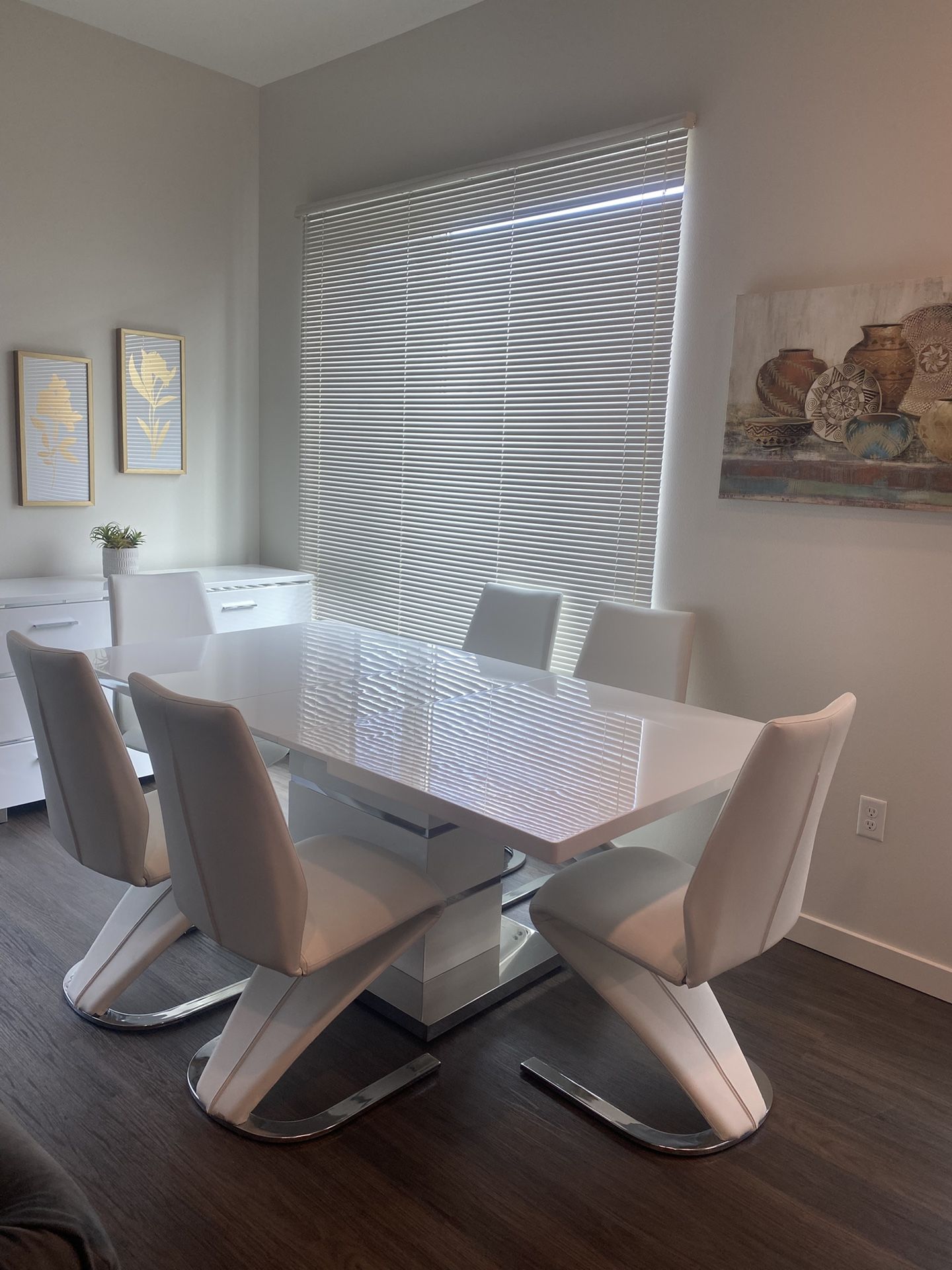 Elevate your home with this sleek dining set! High-gloss lacquer finish, expandable table, and chrome accents make it a stylish upgrade.
