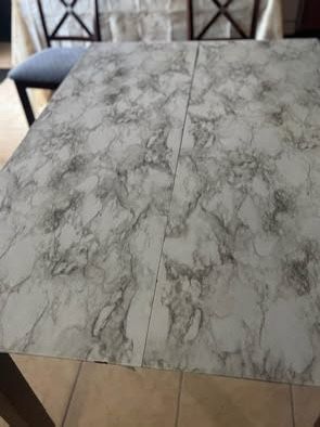 Table is in good condition, it is covered with Countertops Waterproof Marble Contact Paper. You can peel it off. Table do not come with chairs. Comes with extension to make it big or small. Pick up in Edinburg. If you see the list item still available.