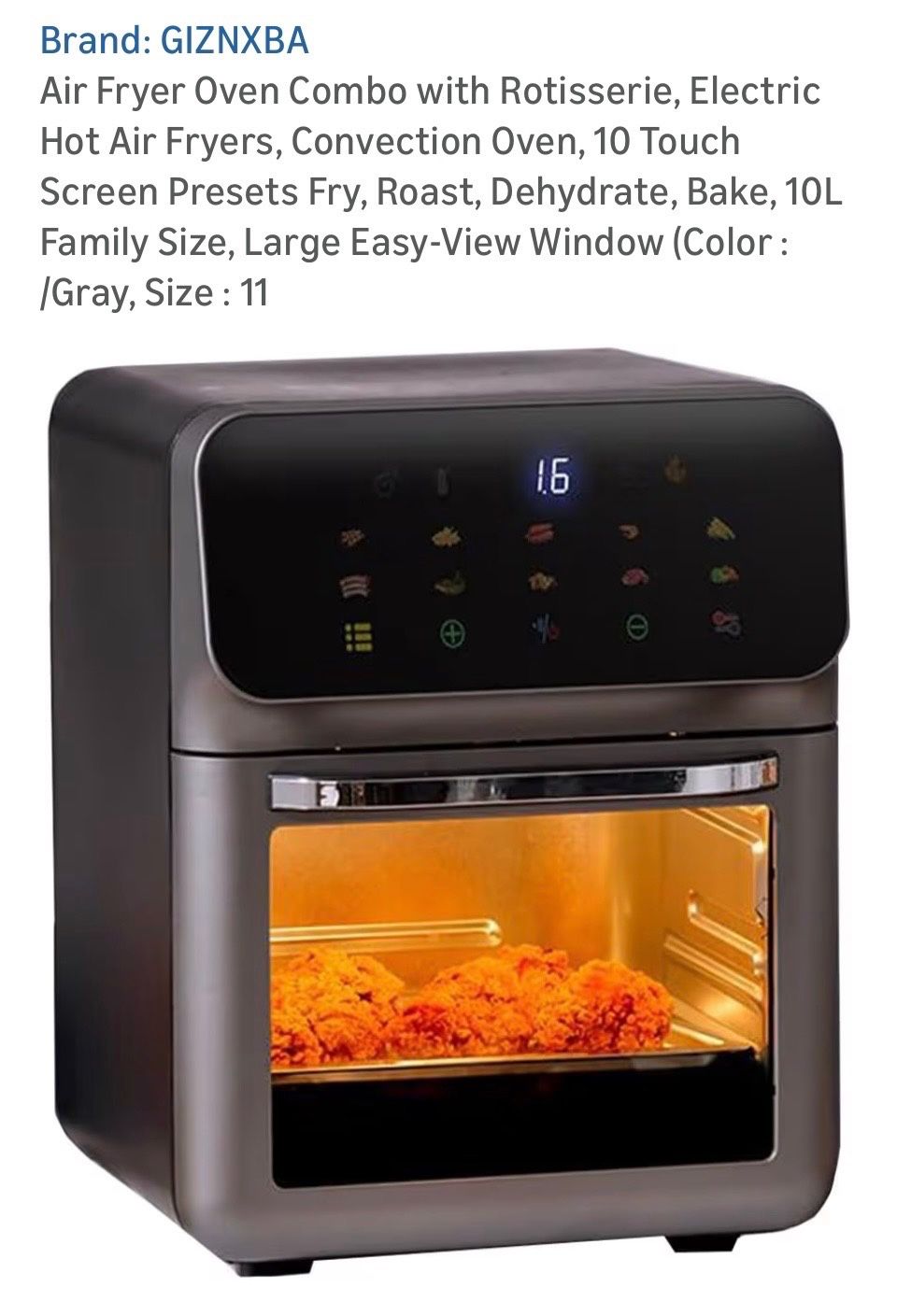 Brand: GIZNXBA Air Fryer Oven Combo with Rotisserie, Electric Hot Air Fryers, Convection Oven, 10 Touch Screen Presets Fry, Roast, Dehydrate, Bake, 10L Family Size, Large Easy-View Window (Color : /Gray, Size : 11