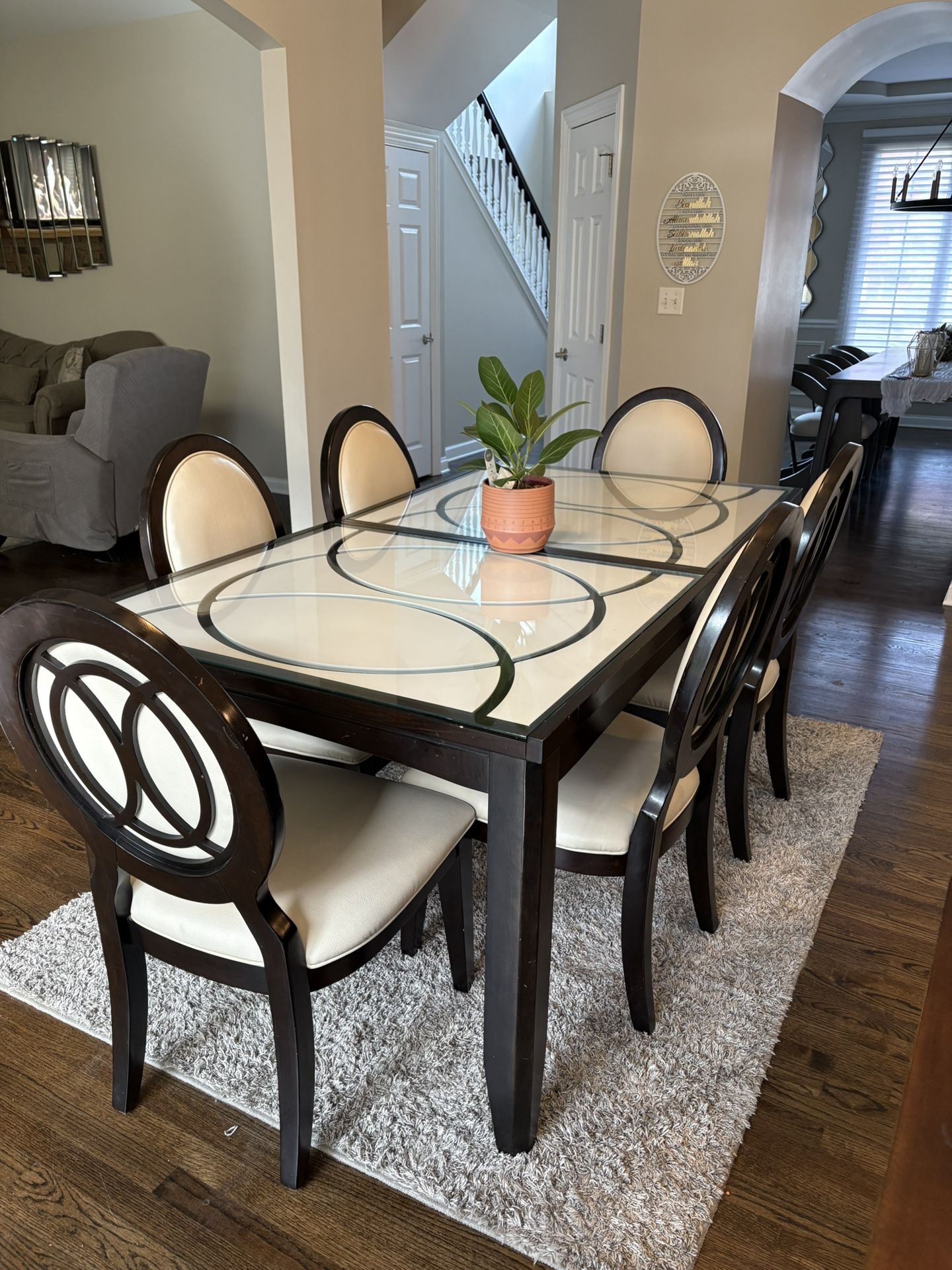 Elegant dining room set featuring a glass-top table with a unique circular design and six leather upholstered chairs. • Rich dark wood frame with cream upholstered seats, leaf included • Stylish glass inset with black circular pattern • Comfortable, sturdy chairs with matching circle-back design • Seats 6 people comfortably • from a smoke-free home
