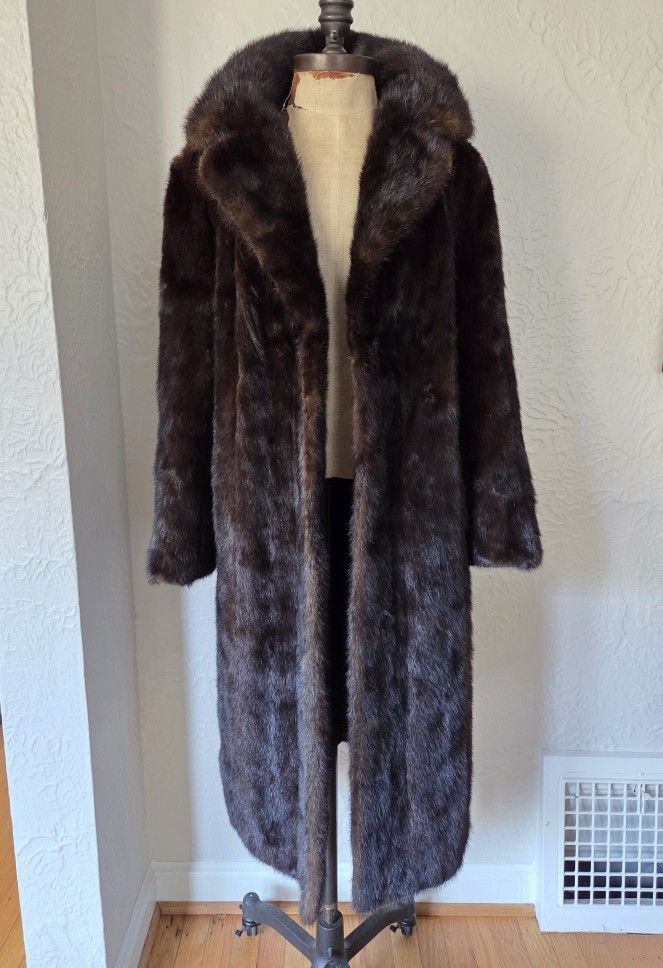 Silky brown mink fur, 42" long. Has vintage length sleeve 22" extra fur inside cuff to extend if needed. Sleeve is narrow for a thin arm (wont fit large arm) Excellent vintage condition. Fits bust size 42" women's medium. PRICE IS FIRM, cash only