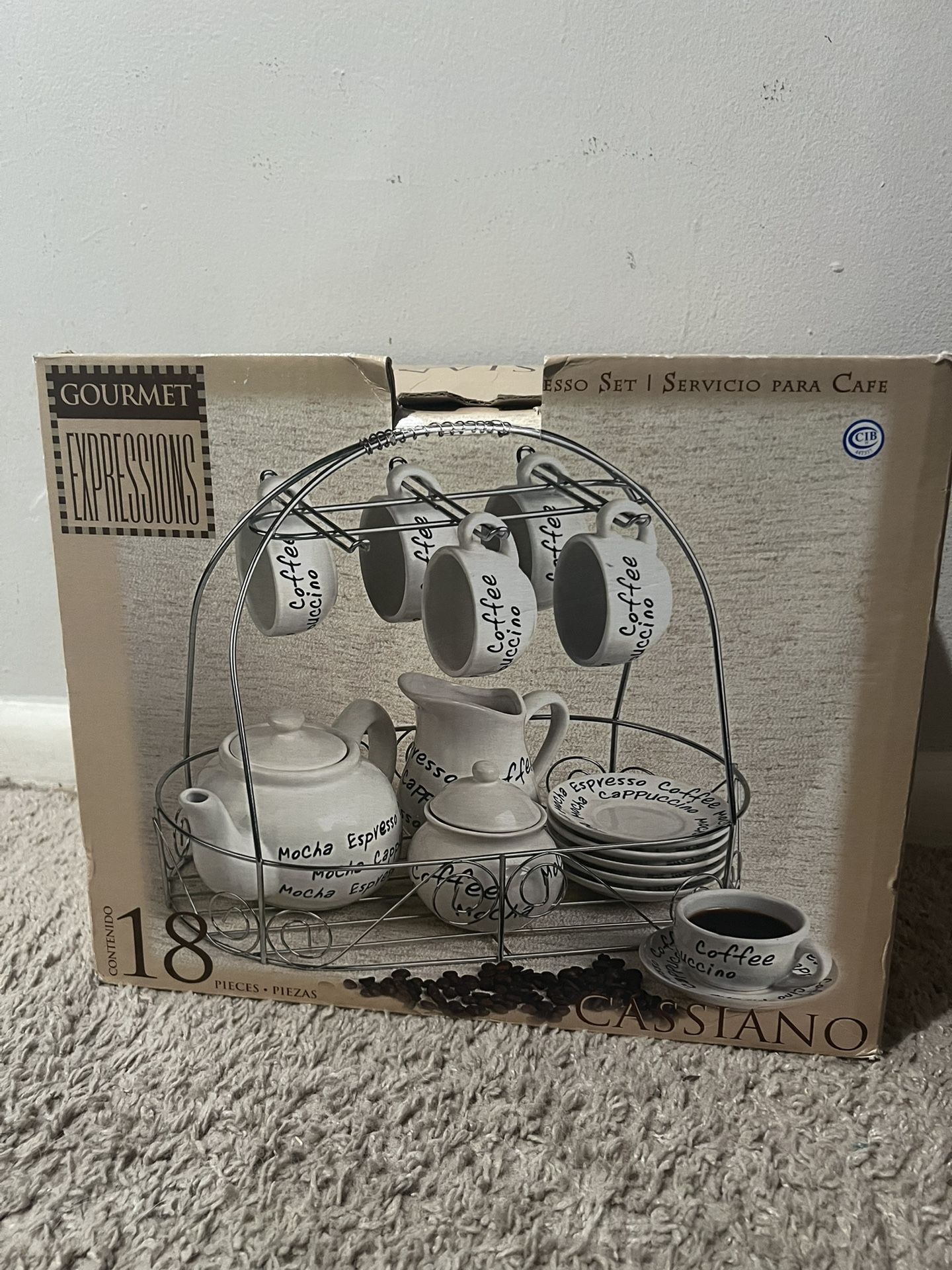 Beautiful Espresso Serving Set never got to use. Great for coffee/ tea too Should be enjoyed! 6 cups/6saucers/rack for counter/sugar 2 pc/ creamer 1 pc / tea/coffee pot 2 pc/ Cash only and local pickup