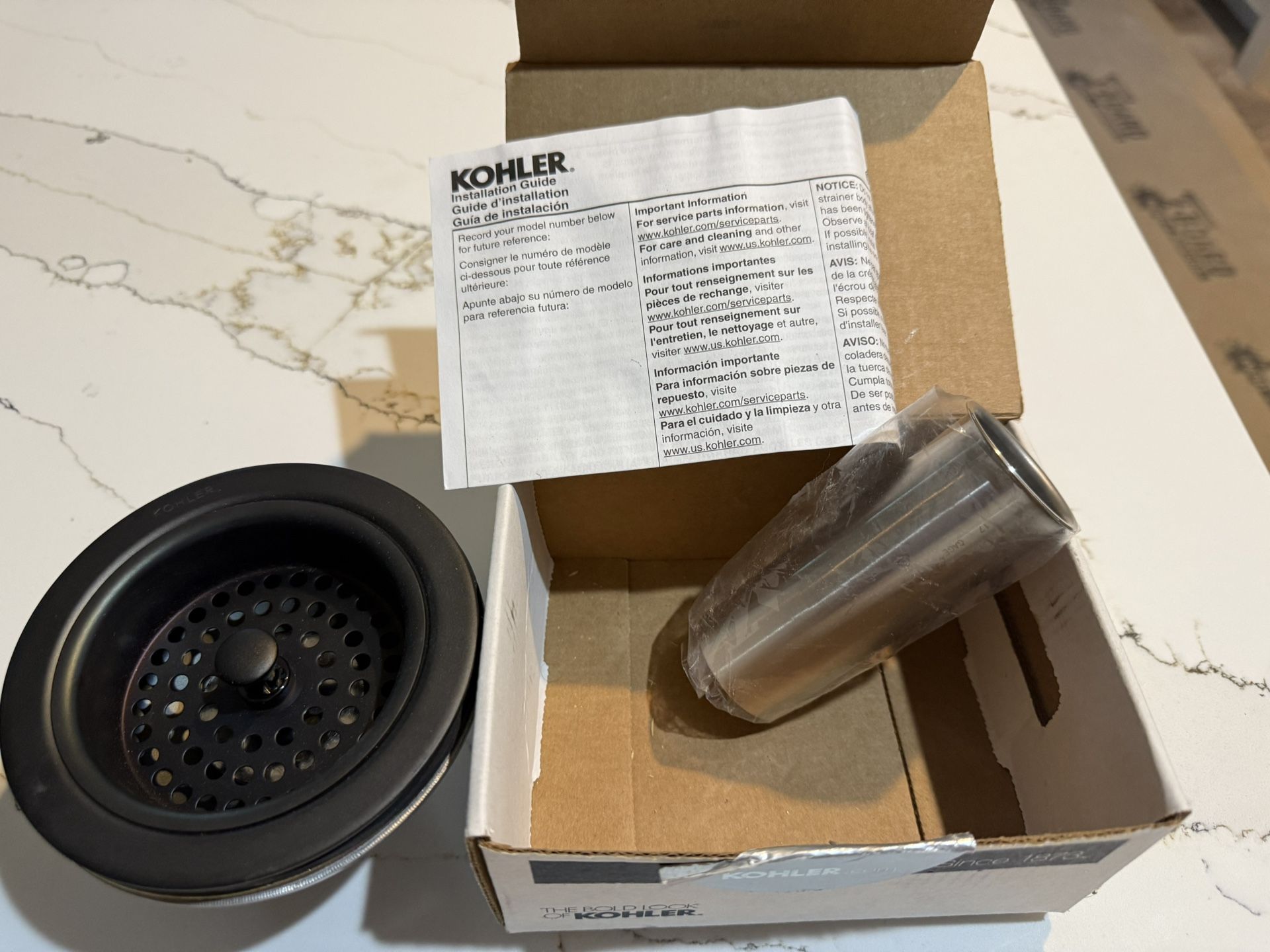 Duostrainer sink strainer in oil rubbed bronze finish. Brand new in box, all instructions and hardware included. 4 1/2 wide base w/ 3 1/2 “ opening.