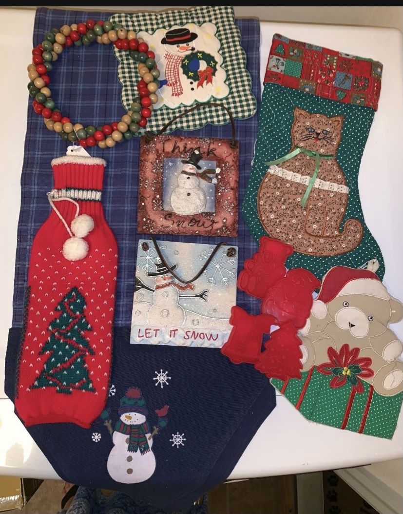 Vintage Christmas -includes :2 pot holders, cat stocking, 6 cookie cutters, 2 hanging ceramic photos , bottle cover & festival wreath & table runner