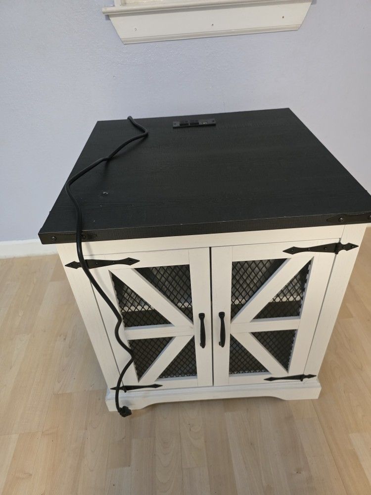 Black and white end table with plug in, adjustable shelf. Only had for 5 months. 24x24x25.