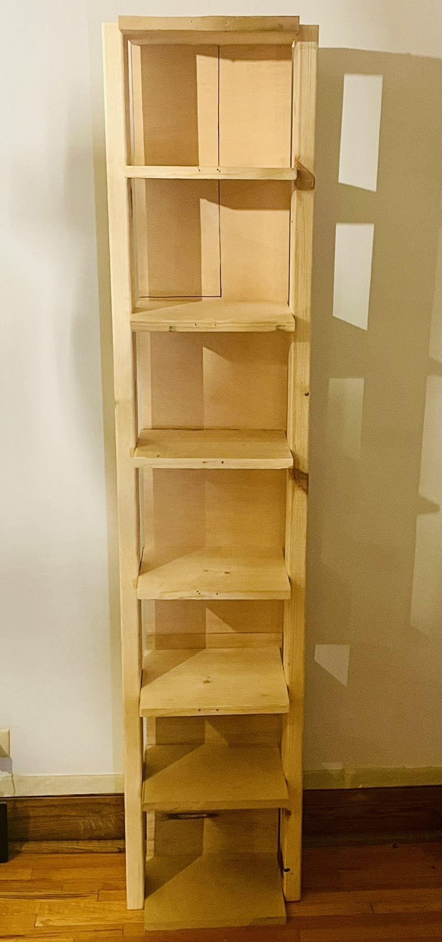 Shelves have 10” in between each - 70” tall x 11” wide and 10” deep. Very sturdy.
