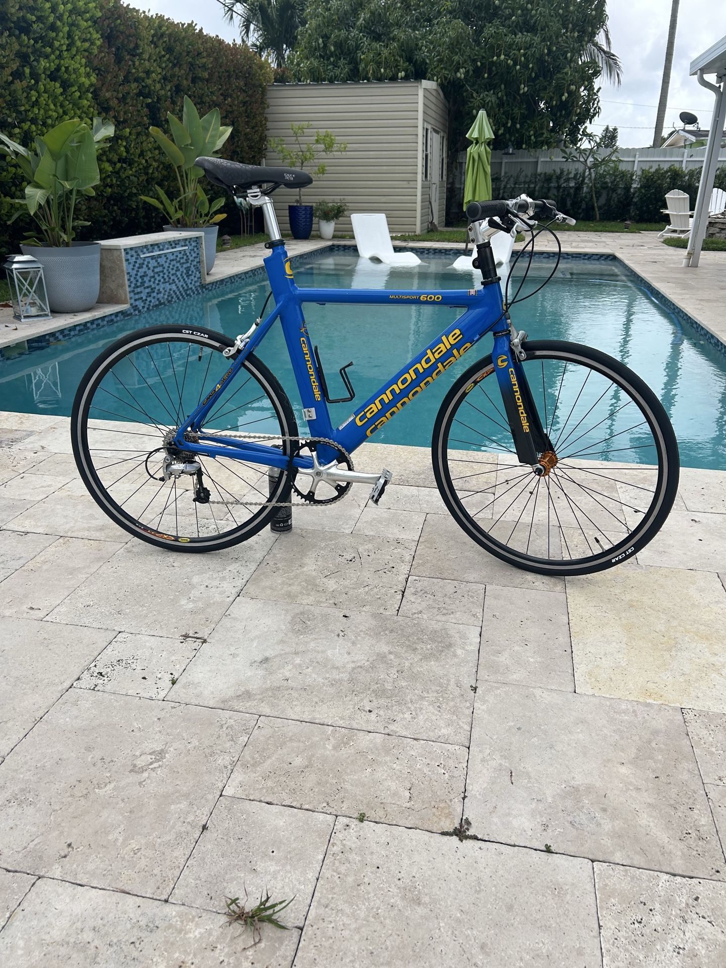 Are you looking for a bike that turns heads on your commute to work, coffee run, or on your way to pick up some local kombucha.. then look no further. This machine is built for fun and is incredibly comfortable despite it looking like a race bike. It is equipped with some of the finest parts from shimano… well at least the finest for what this bike is for. A shimano XT shifter leads the shifting process with a buttery feel, fresh cables glide smoothly across the housing moving that Sora derailour up and down the shimano 8 speed cassette. Brand new chain looks incredible gorgeous and complements the shine of the frame. 105 brakes provide exquisite stopping power as well as the Hayes brakes lever however who wants to stop when they are on a bike this cool. Carbon fiber fork smooths out road bumps and the cane creek headset is buttery and silky smooth. The geometry on this bike is crazy…. in the best way possible. It is suited for someone 5'6" – 5'10" who wants comfort on a sporty looking bike. Short chain stays and top tube make this bike snappy and super fun to wheelie around and hop over curbs and train tracks. Original Cannondale bars, pedals and other stuff is still on and going strong. Let me know if you have any questions and i’ll be more then happy to help (: