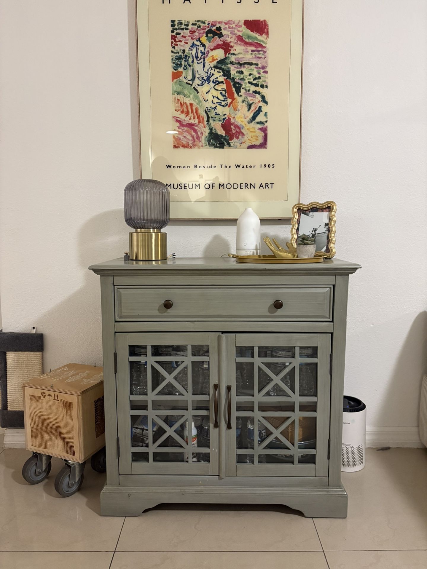 Beautiful vintage-style wooden accent cabinet in a soft sage green finish. Features one smooth drawer and two glass-panel doors with a decorative lattice design. The cabinet offers stylish storage for any living room, entryway, or bedroom. Perfect for displaying décor or organizing essentials. • Solid wood construction • Distressed sage green finish for a rustic-chic look • Clear glass doors with cross-pattern frames • Metal handles and smooth drawer glide • Dimensions: 35” x 15” x 35” Excellent condition. Smoke-free home. Keywords: accent cabinet, vintage furniture, farmhouse style, rustic chic, glass door cabinet, entryway storage, living room furniture, sage green cabinet, home décor.