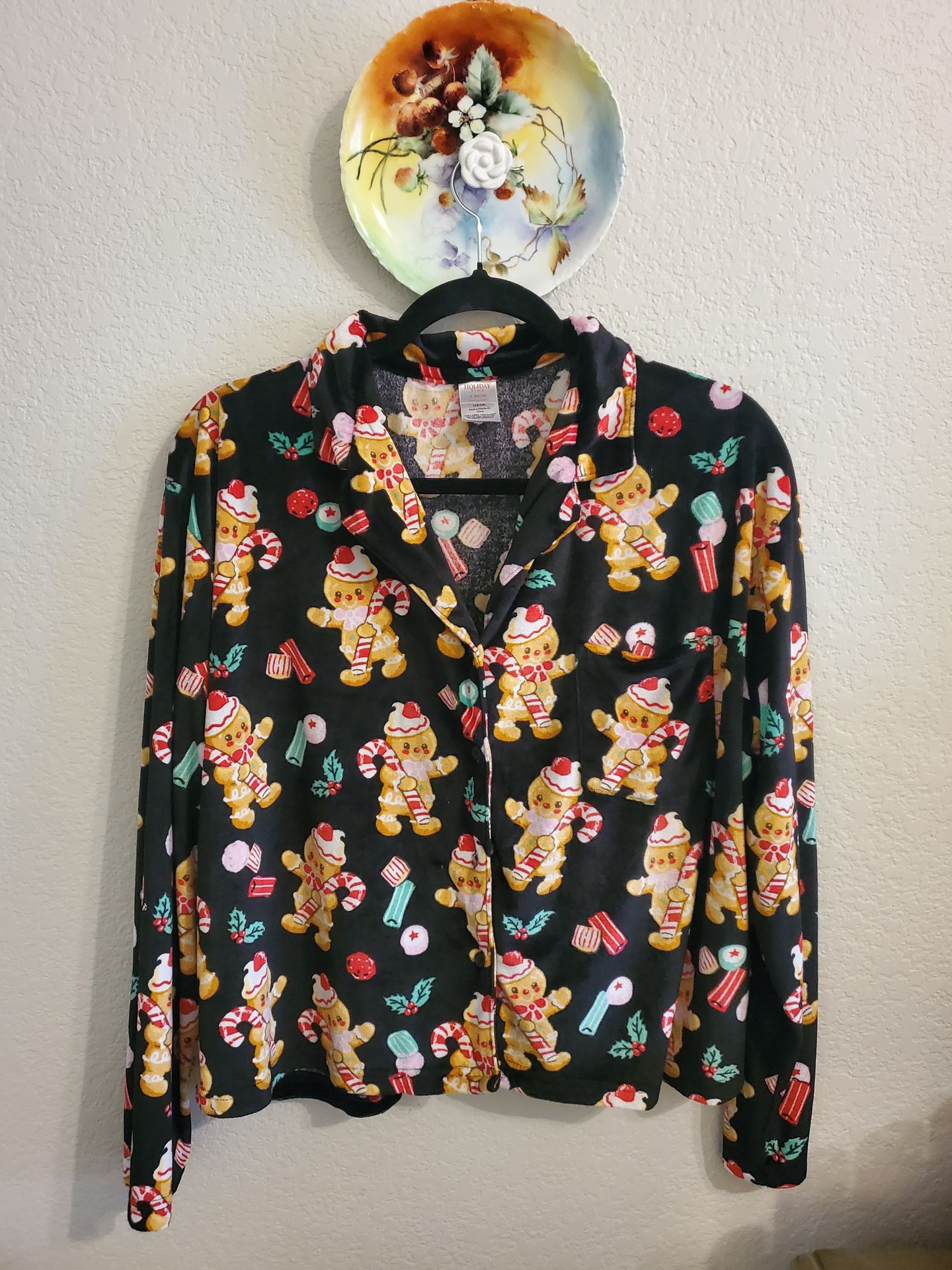 This Holiday Time Gingerbread Pajama Top features festive gingerbread men in a multicolor design, perfect for the Christmas season. Made of lightweight polyester material, this long sleeve top with a collared neckline is machine washable for easy care. The button accents add a playful touch to this cozy and comfortable pajama top, ideal for winter nights. Holiday Time Gingerbread Pajama Top, part of a festive two-piece set featuring gingerbread men, candy canes, and other holiday treats on a black background. This specific design gained popularity and was considered a "viral" holiday item at Walmart. Product Details Brand: Holiday Time (typically sold at Walmart). Material: Described as either soft velour, minky fabric Design: A button-down, long-sleeved top with a notch collar and a chest pocket.