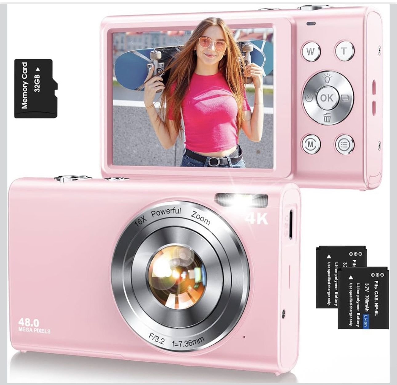 Digital Camera,Autofocus 4K Vlogging Camera for Photography with 32GB Card,48MP Portable Compact Point and Shoot Digital Camera for Teens Adult Beginner with 16X Zoom,Anti-Shake,2 Batteries(Pink)