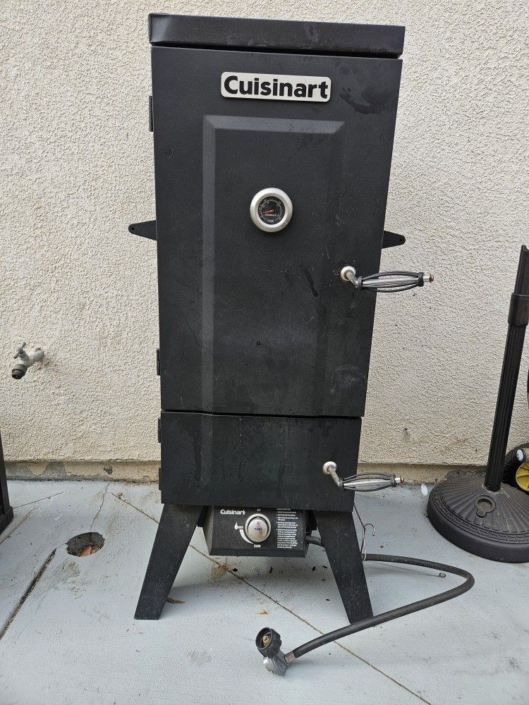 **Just in time for the 4th of July!** Cuisinart Vertical Smoker Takes woodchips 4 Racks Comes with Cover $80 Can hold up to 3 full rack of ribs Just needs a scrub down. (Propane not included) Pickup only in North Fontana area. If the posting is still up, it's still available. Serious Buyers only please, need it gone ASAP.
