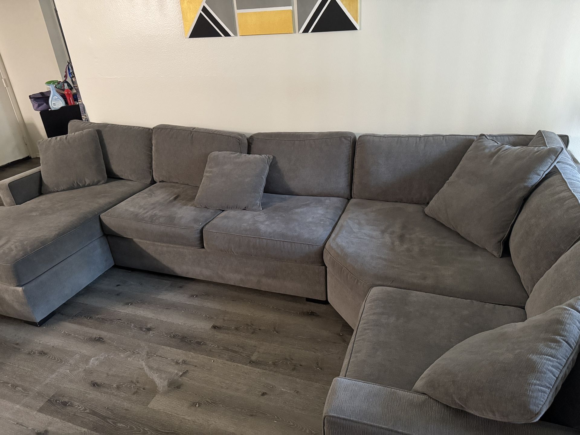 U-Shaped couch available for sale. Couch is about 3.5 years old. Very comfortable to sit on. Comes with three normal sized throw pillows and one oversized throw pillow. Comes with cleaning kit. All cushions are removable and machine washable. Same with the throw pillows. Can be broken down into 4 pieces. Available for pick-up on 4/4 or any weekend in April Dimensions: 150x84 inches