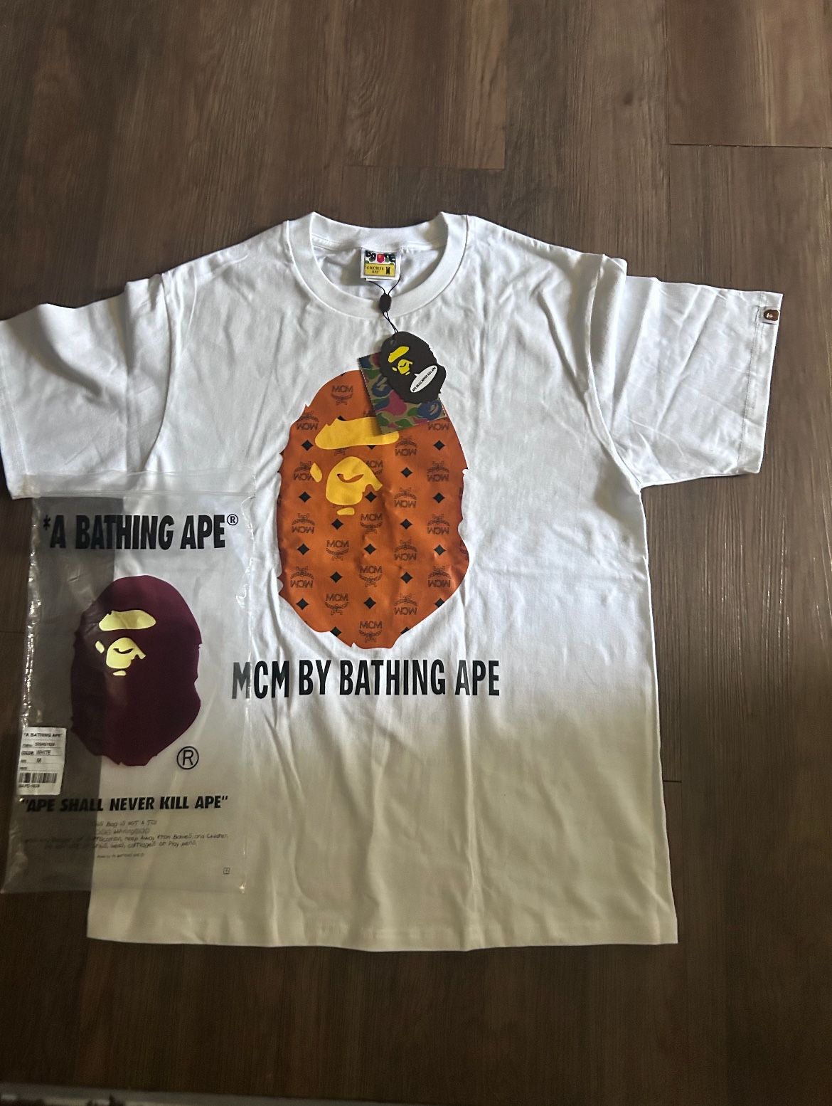 BAPE x MCM white and yellow streetwear tee #BAPE white, graphic tee, streetwear, bold print, layered, casual, urban style, pop culture, statement piece, street fashion size medium