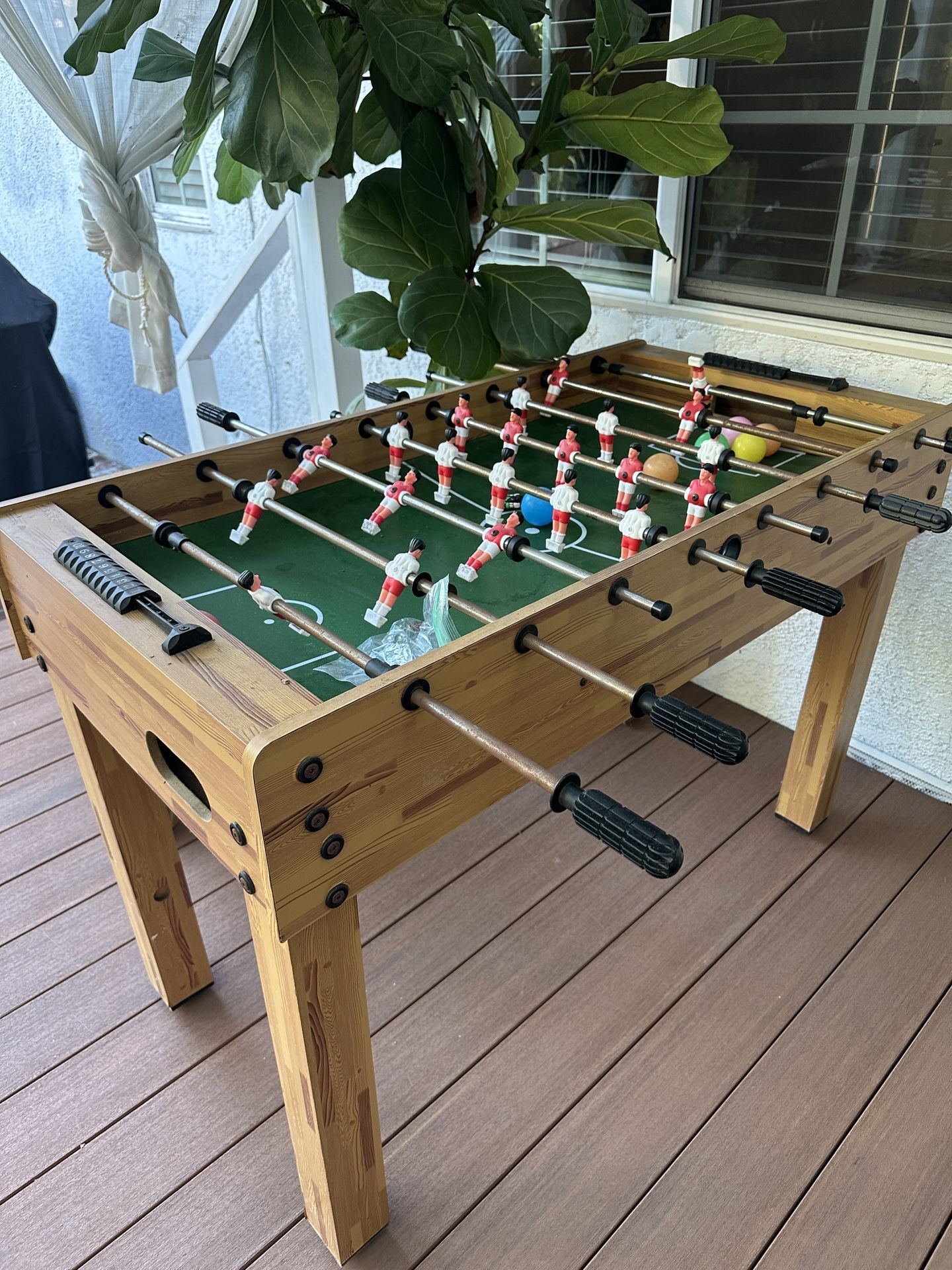 Sturdy foosball table in great condition. Smooth rods, classic red & white players, and fun for kids or adults. Clean, well cared for, and ready to play. Includes balls. Great for game room or patio.