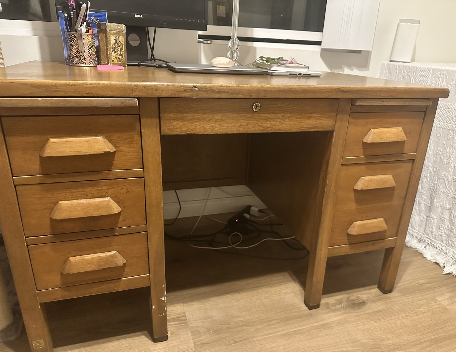 Sturdy vintage desk made from solid wood (no pressboard or veneer). 50” L 31” H 30” W. Lots of storage and very functional. I love it but my new office is smaller. I did modify the back legs to be removable and easier to move. Last picture shows where double sided screw used to remove legs. Also helps (as was in my case when floor is not level) $75 obo!