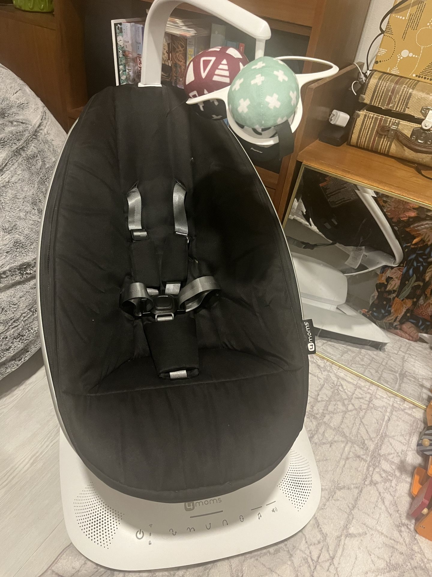 Selling my gently used 4moms MamaRoo 4 infant swing (Model 1046). It’s in excellent working condition, very clean, and has been well cared for. All motions and sounds work perfectly. The only issue is that one of the three toy balls is missing, but the mobile arm and the remaining two balls are included and fully functional. Features: Multiple motion settings (car ride, kangaroo, tree swing, rock-a-bye, wave) Adjustable recline Built-in sounds + Bluetooth connectivity Soft black seat fabric (freshly cleaned) 5-point harness Sturdy and smooth-running base Included: MamaRoo 4 swing Toy mobile with 2 of the original 3 balls Power cord Condition: Very clean Pickup Only From a smoke-free, pet-friendly home