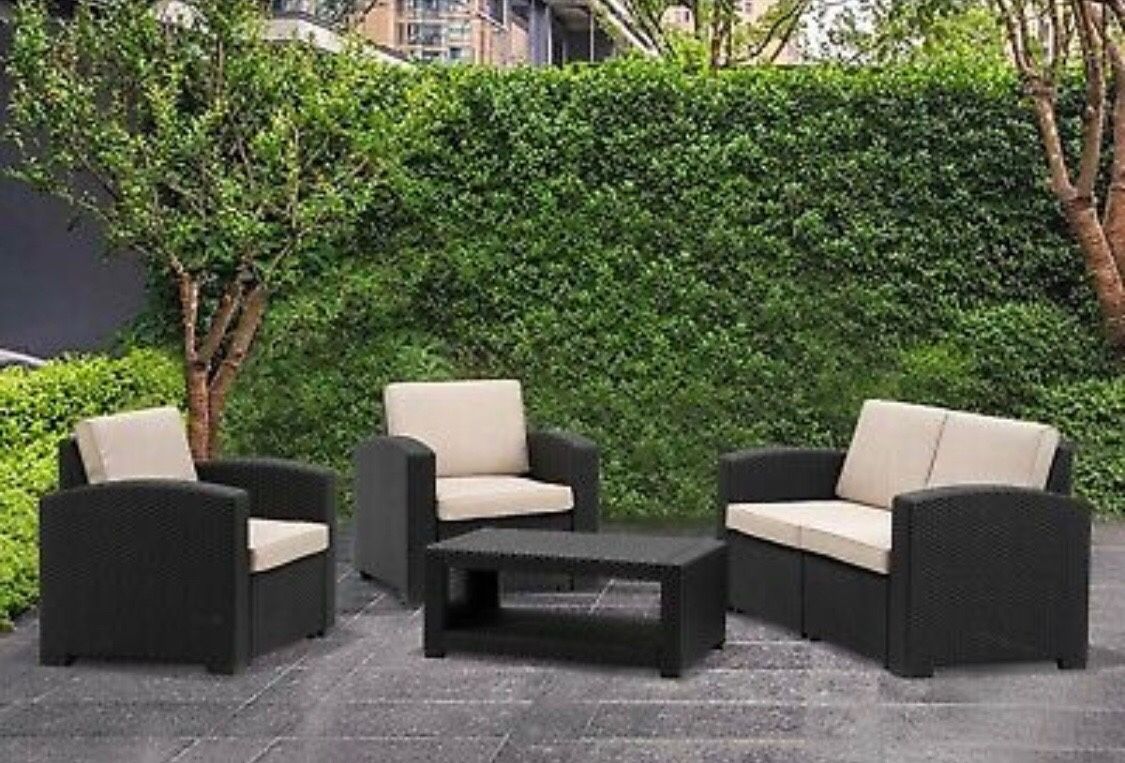 Beautiful Black and Tan patio lawn furniture. Chairs/couch and table