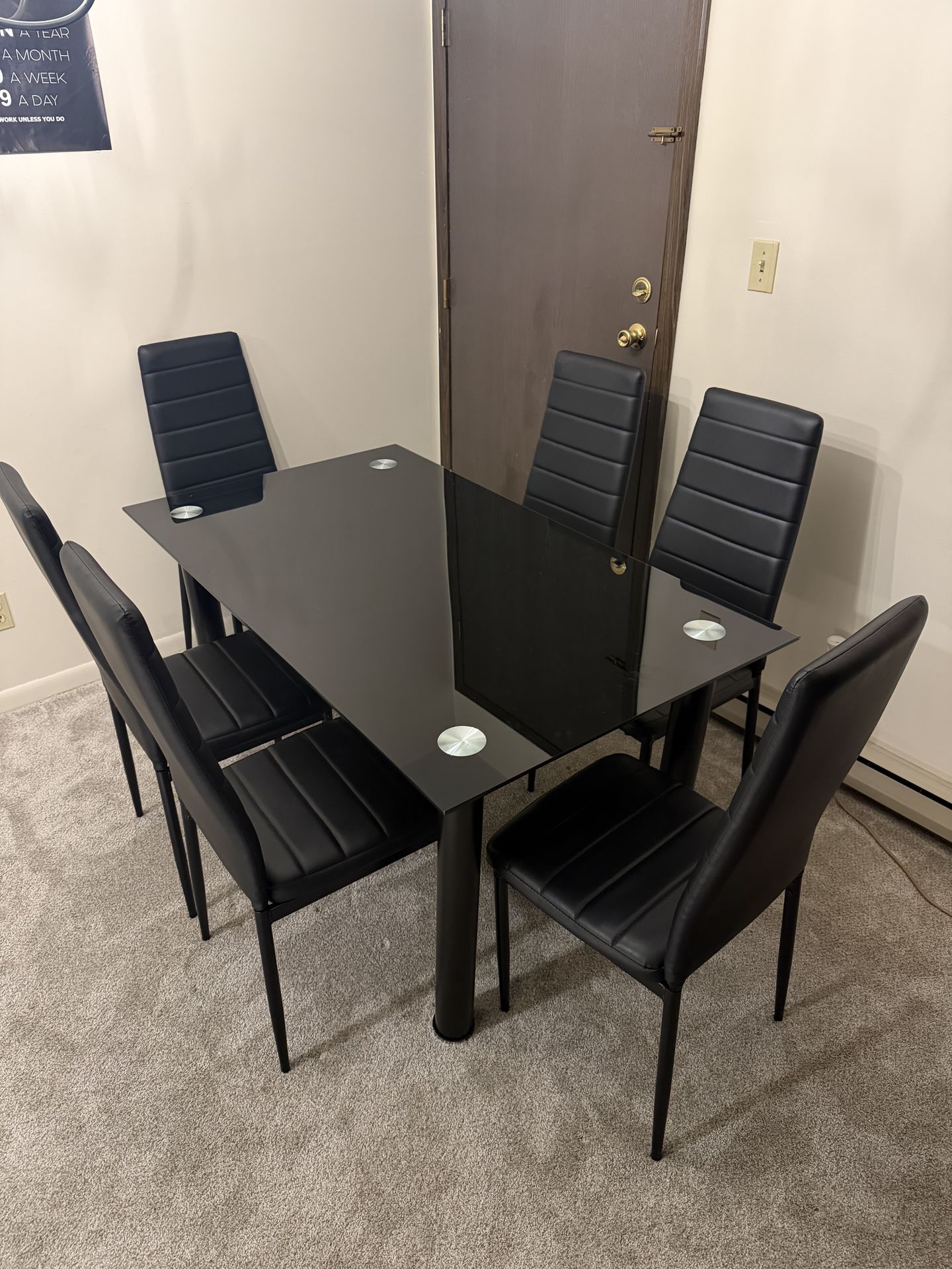 Selling a modern black glass dining table with 4 matching chairs. Good condition. • Glass top – no cracks or scratches • 6 black leather-style chairs • Very sturdy and modern design • Clean and well maintained Looks like new. Moving and need gone soon. $250 OBO Pickup only (60441)