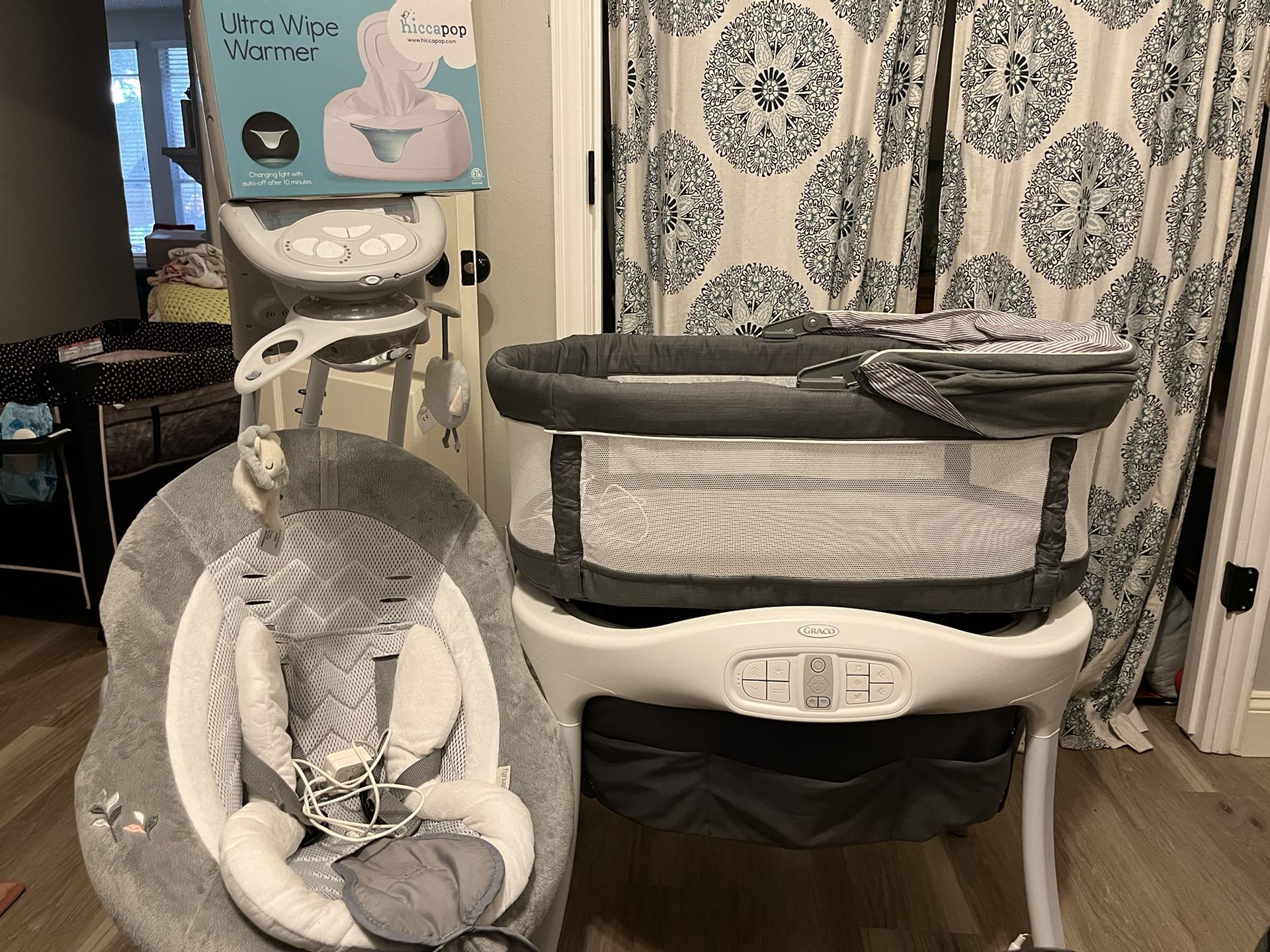 Swing, wipe warmer, bassinet