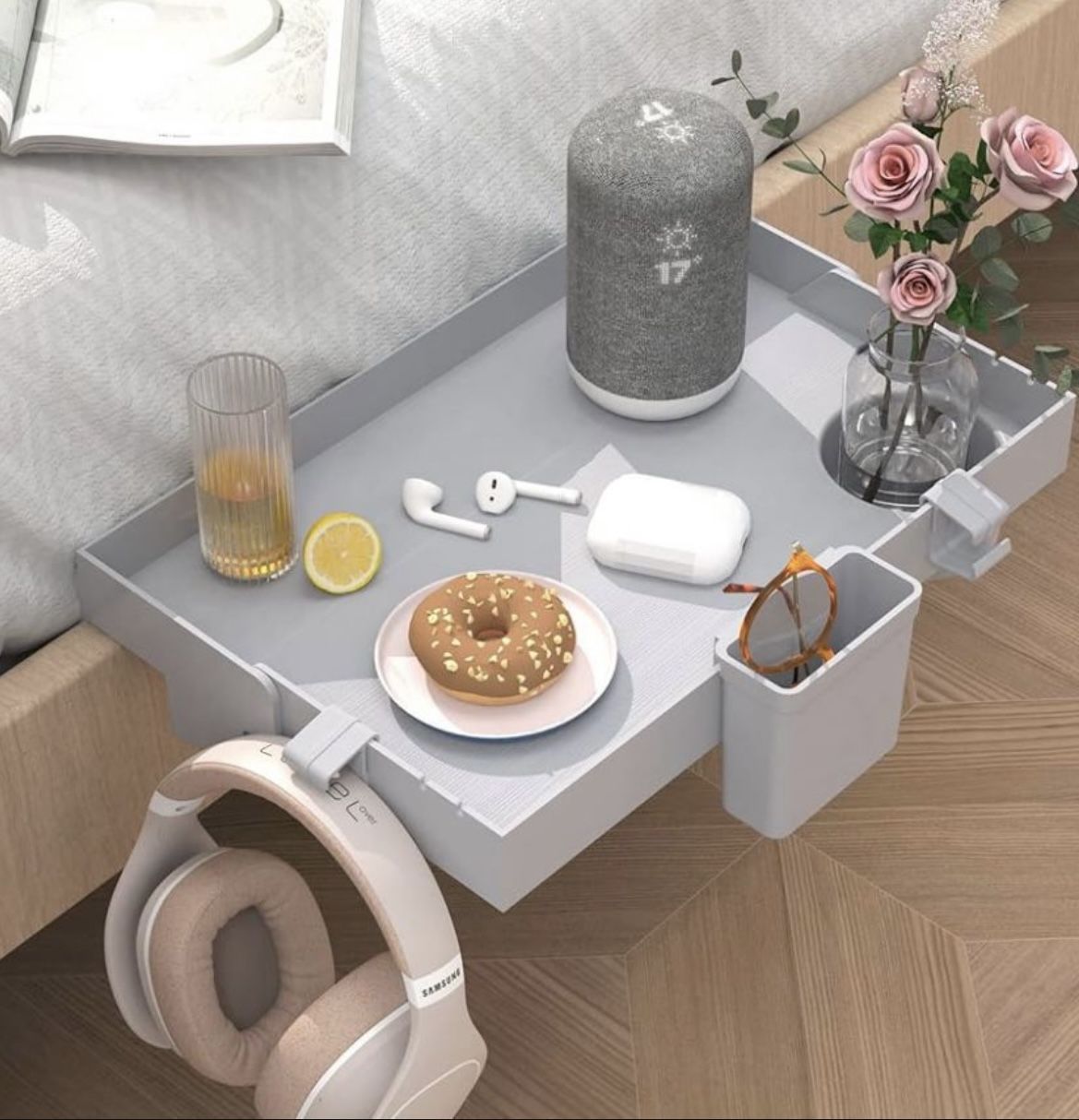 Open box///has not been used. Bed Shelf Organizer, Bedside shelf tray, Nightstand for College Dorm, Loft Bed Plastic Bedside Shelf Tray. Hooks Hanging Cup, Small Size color is Gray.