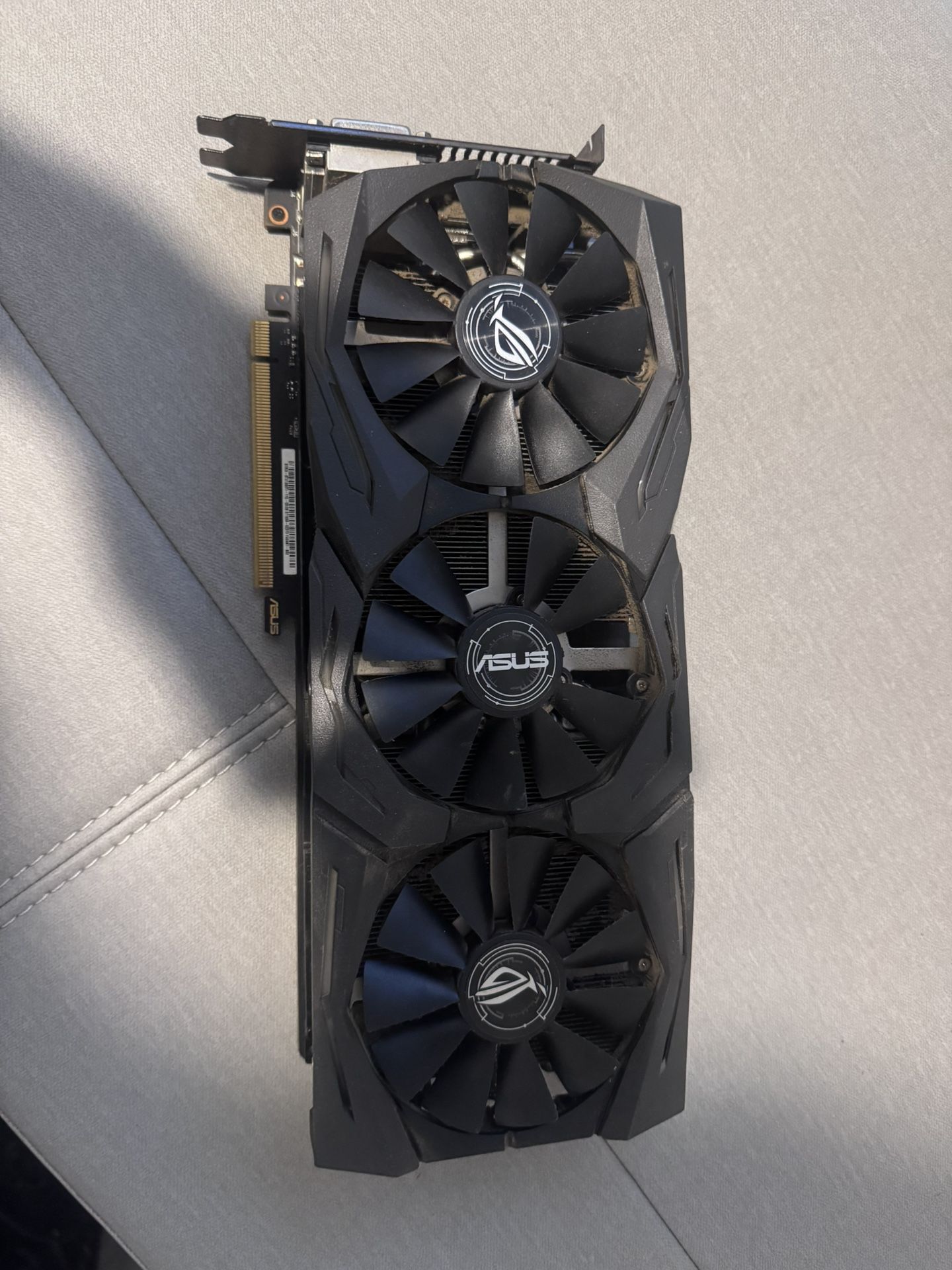 ASUS 1080ti Strix Asus Crosshair Hero VI x370 WiFi m.2 type c EVGA 750 G2 modular psu Coolermaster 212 black cooler 16gb ddr4 crucial 16-18-18-36 Ryzen 7 1800x All works great but dusty, run open air last few years of service. Center fan of gpu has two blades that have detached. Cheap part on Amazon but I just zip tied that fan and the other two kept temps fine. It could probably benefit from a re paste but I haven’t opened. 225 obo