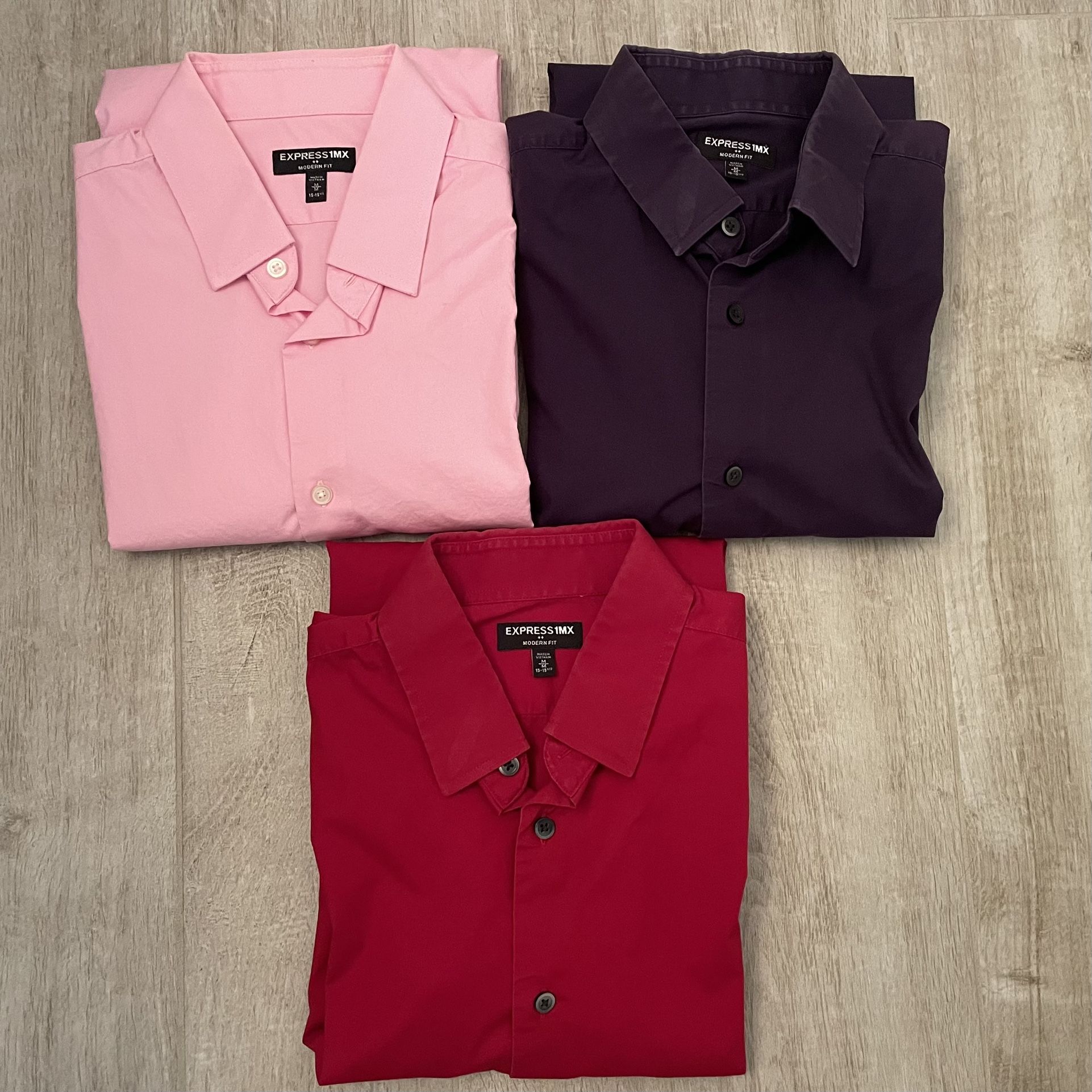 3 x Express 1MX Modern Fit Button Down Dress Shirt, Size M Red, Pink, Purple